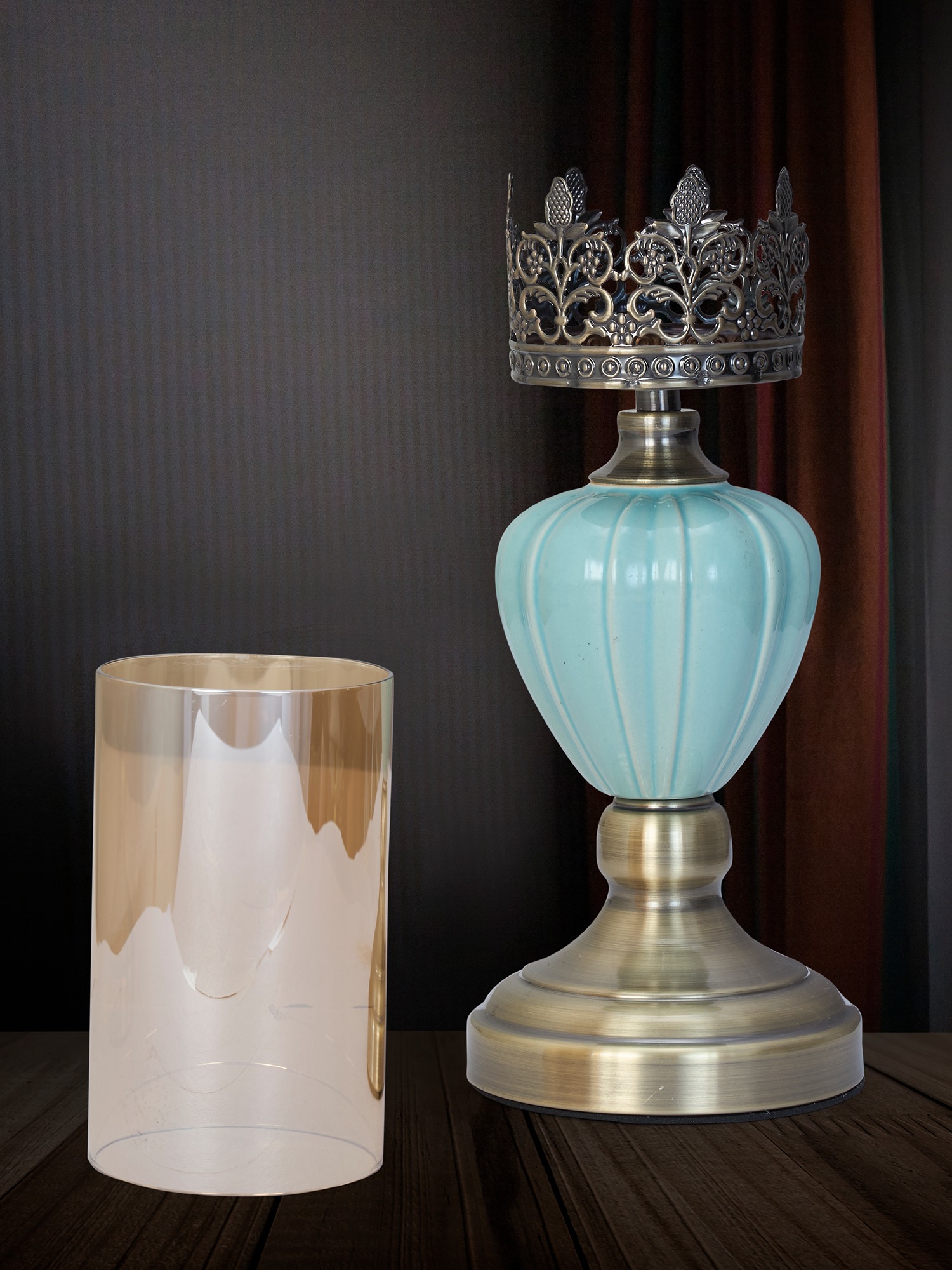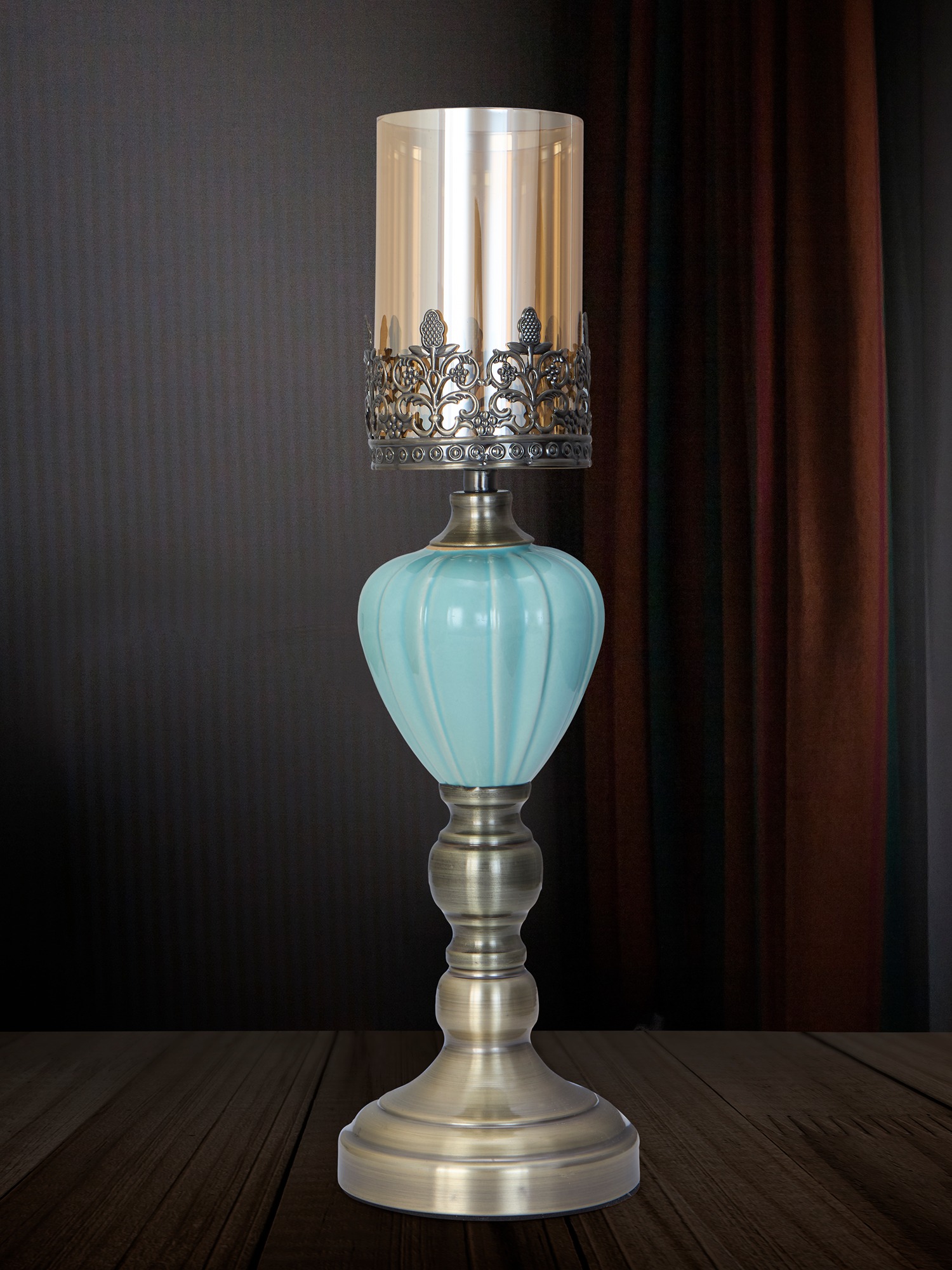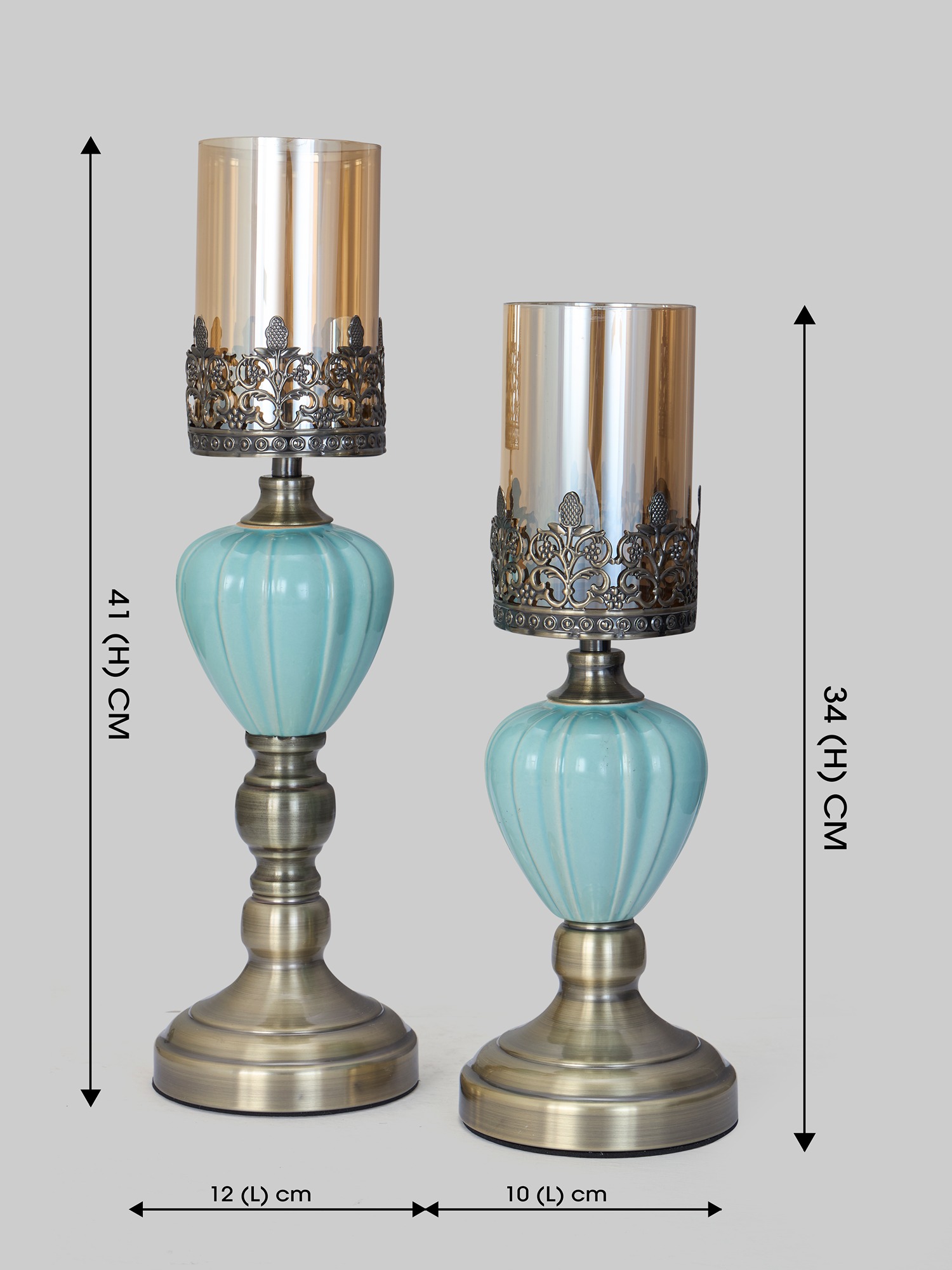 Elevate your interior décor with the timeless charm of the MODECOR Turquoise & Brass Candle Holder Set of 2 (AGT-1025-LIGHT BLUE). This stunning pair combines a rich turquoise ceramic base with an intricately designed brass stem, topped with a golden metallic glass shade featuring elegant cutwork detailing. Perfect for creating an ambiance of warmth and sophistication, these candle holders are ideal for dining tables, sideboards, or as a centerpiece for festive occasions. Add a touch of vintage-inspired elegance and luxurious style to your space with this beautifully crafted set.