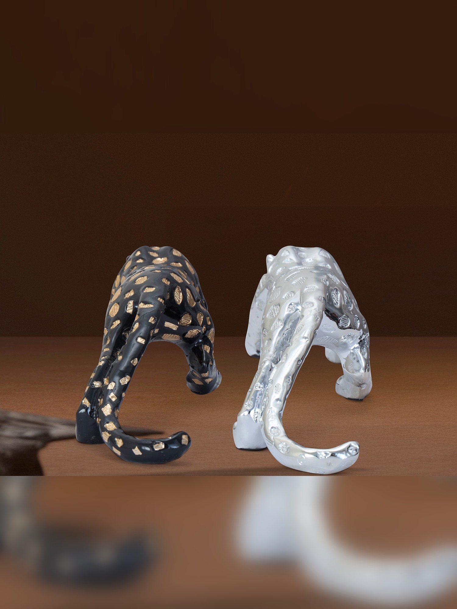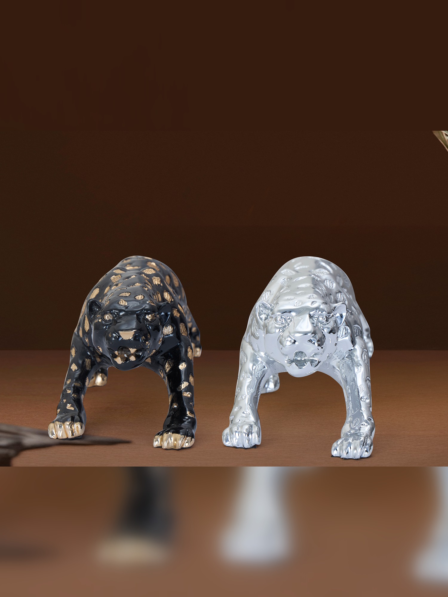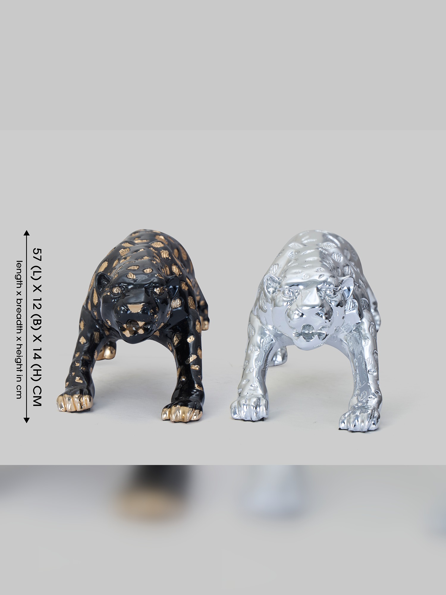 Transform your decor with the elegance of the MODECOR Modern Panther Sculptures(AGT-1030-SILVER)(AGT-1031-BLACK). This captivating duo features two striking panthers—one in a sleek chrome finish and the other in black with gold accents. Crafted with meticulous detail, these sculptures embody strength and sophistication, making them the perfect centerpiece for any modern space. Ideal for display on console tables, shelves, or desks, they add a touch of luxury and artistry to your home or office. Let the timeless allure of these majestic panthers elevate your interiors with their bold presence and exquisite craftsmanship.