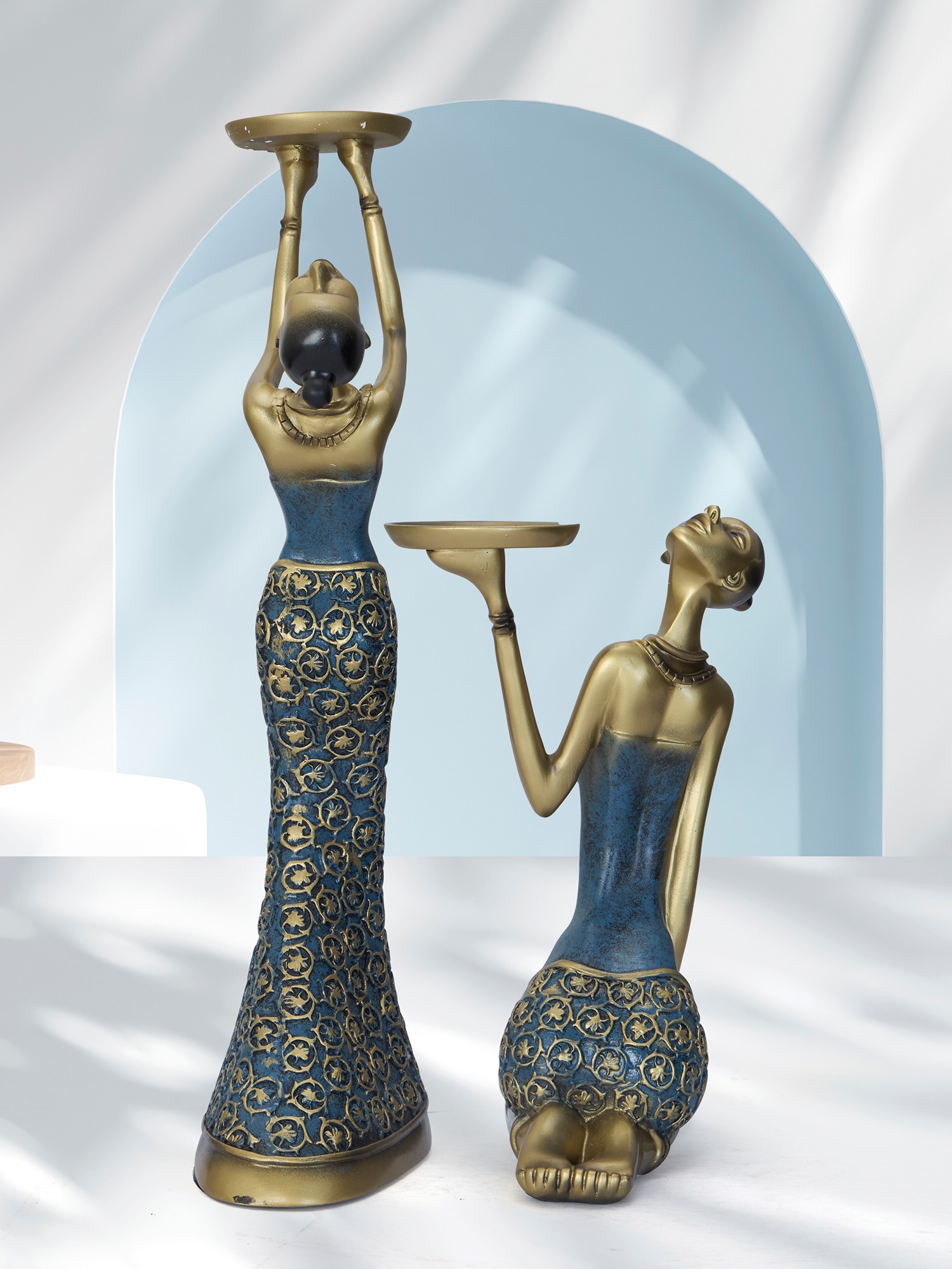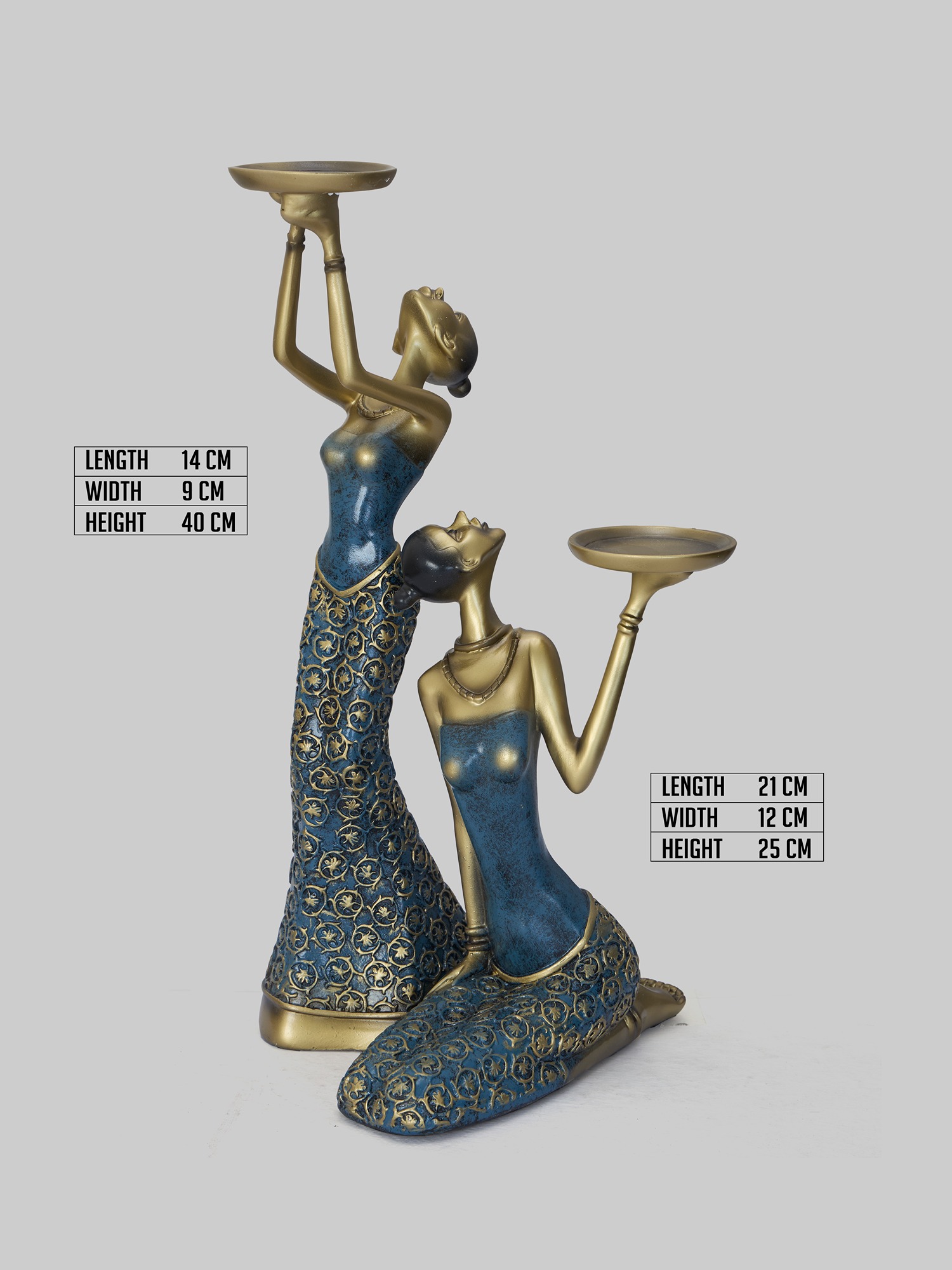 Transform your space with the regal elegance of the MODECOR Women Sculpture Candle Holders Set of 2 (AGT-1034-DARK GREEN). These stunning pieces feature intricate detailing, showcasing the grace and beauty of women in traditional poses. Adorned in a mesmerizing combination of gold and blue, the designs on their attire evoke a sense of opulence and sophistication. Perfect for enhancing the ambiance of any space, these candle holders are ideal for living rooms, dining tables, or as statement pieces for festive and special occasions. Illuminate your surroundings with their timeless charm and exquisite craftsmanship, adding warmth and artistry to your home or office decor.