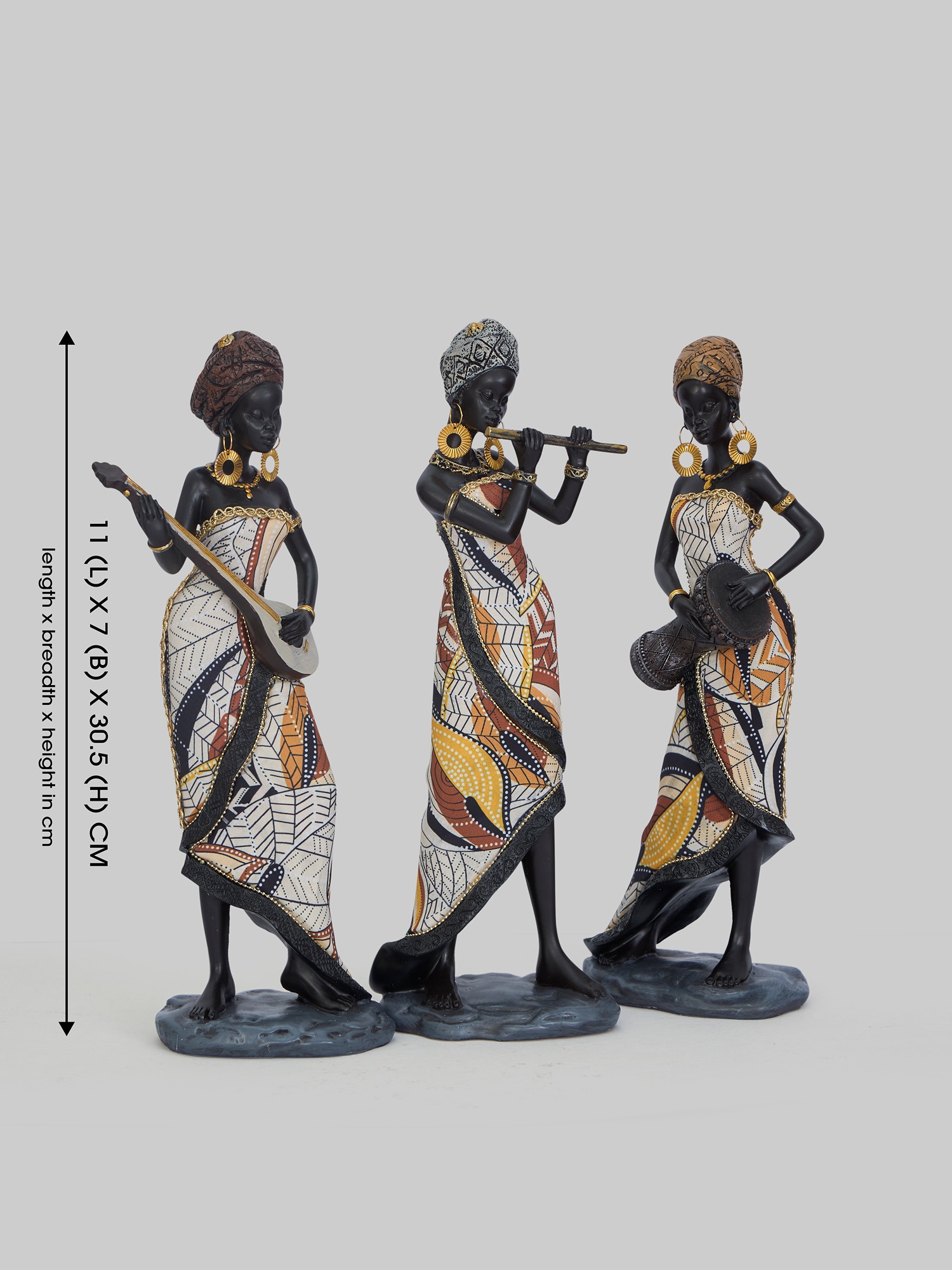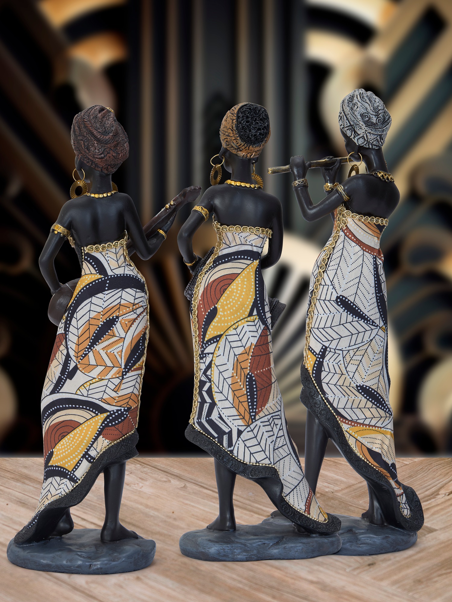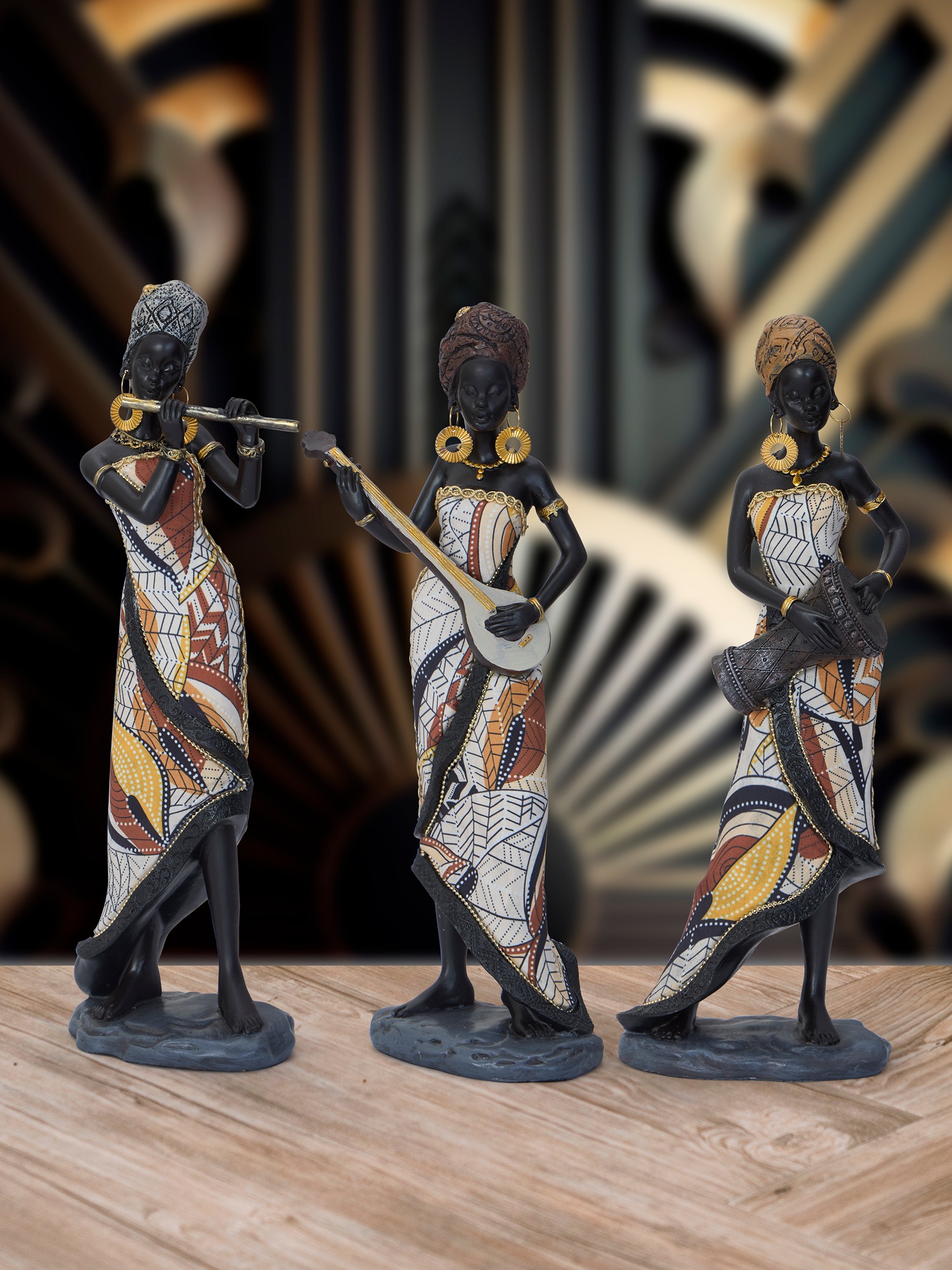 Transform your space with the vibrant artistry of the MODECOR Musical Tribal Figurine Set of 3 (AGT-1042-DARK BROWN). Featuring three elegantly crafted figures dressed in colorful, patterned attire, each playing a traditional instrument, this set celebrates culture and creativity in a striking visual display.Perfect for enhancing living rooms, hallways, or artistic collections, these figurines exude charm and cultural depth. The intricate details, bold patterns, and rich hues make them a captivating focal point, while their lifelike expressions bring a dynamic energy to any setting.Add the MODECOR Musical Tribal Figurine Set to your décor collection for a touch of cultural sophistication and artistic elegance, elevating your home or office with their unique blend of tradition and modern craftsmanship.