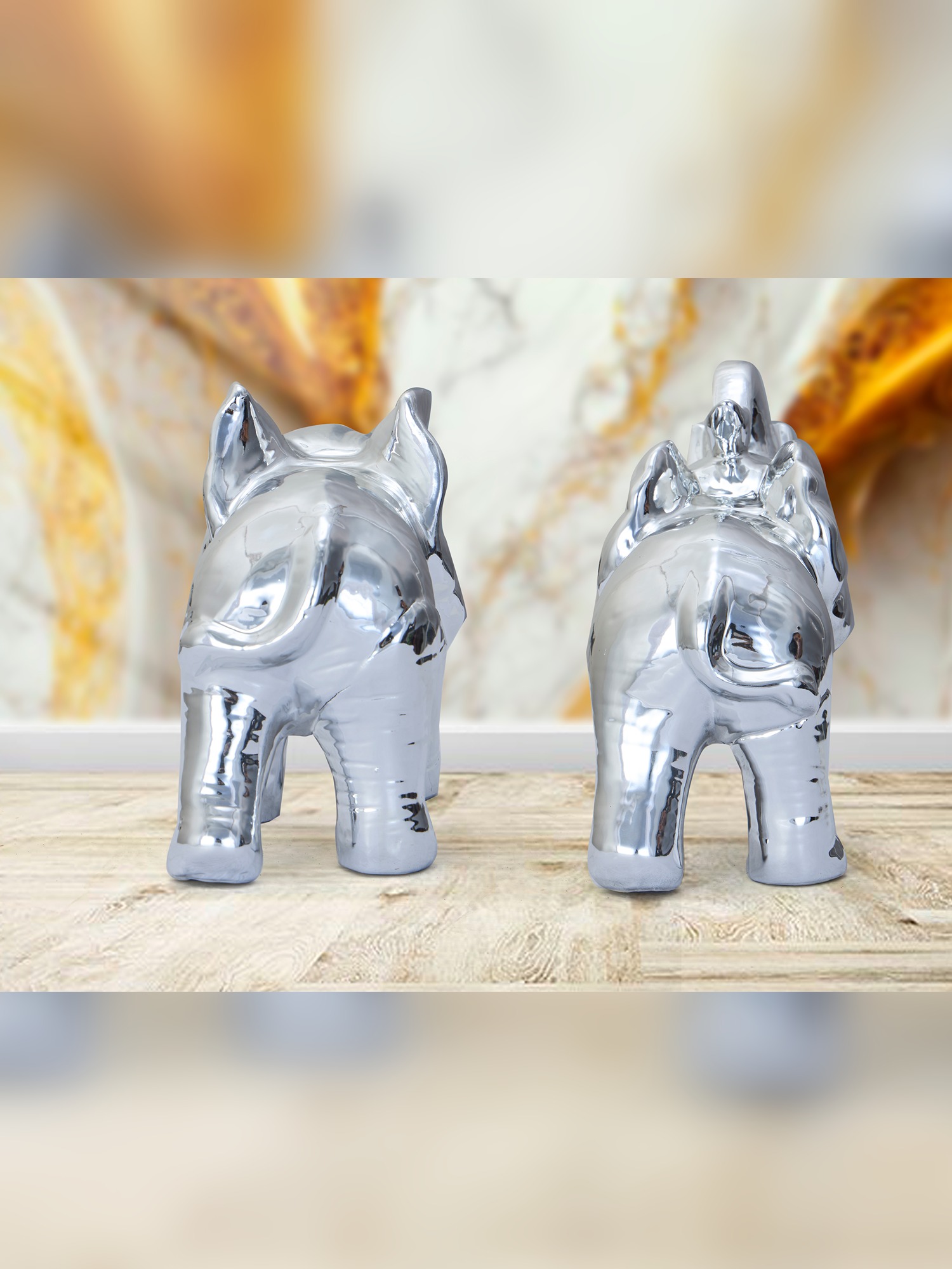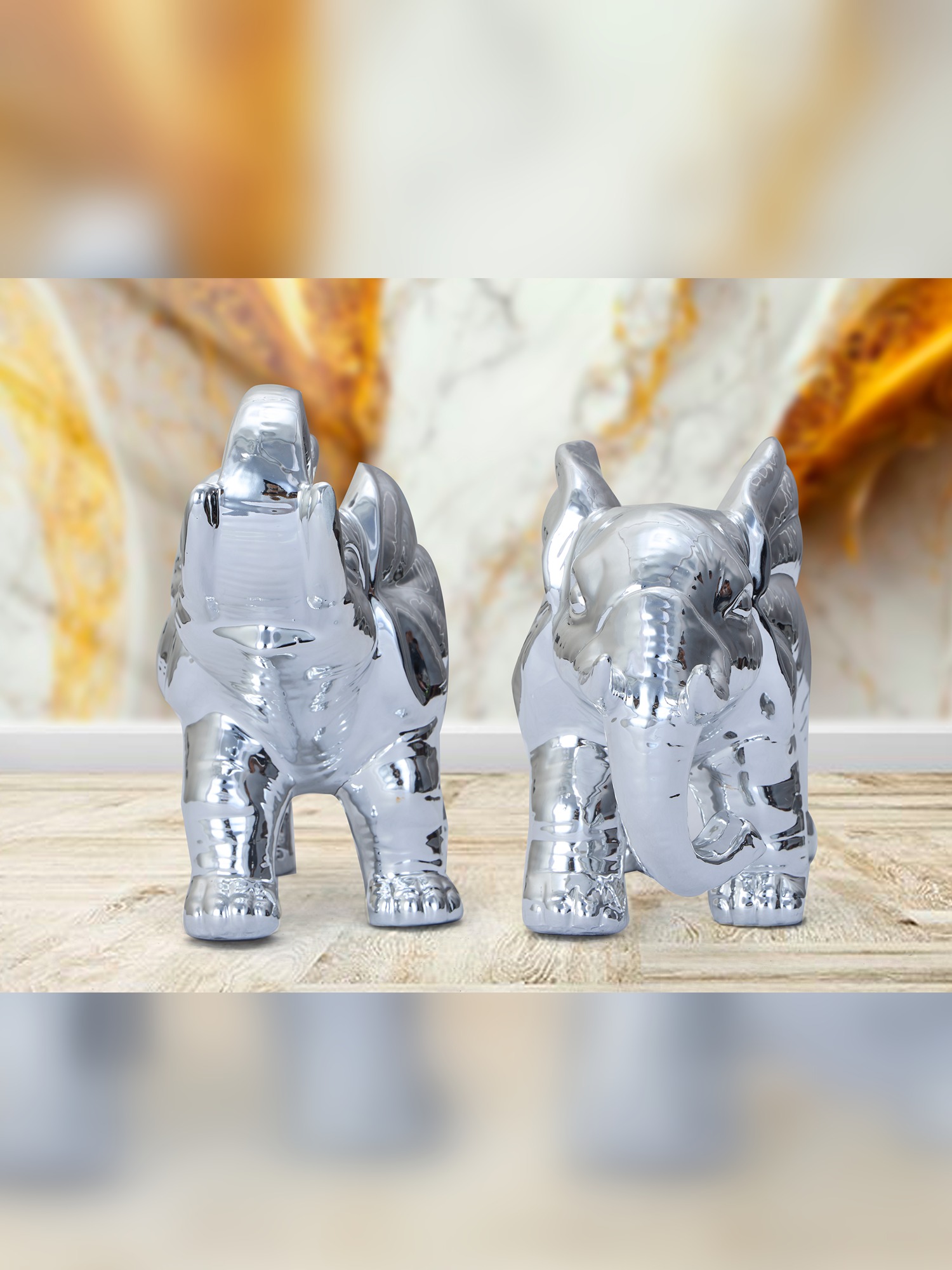 Transform your décor with the shimmering elegance of the MODECOR Silver Elephant Figurine Set of 2 (AGT-1046). Featuring two beautifully sculpted elephants with a sleek, reflective silver finish, this set exudes sophistication and charm, making it a stunning addition to any space. Perfect for living rooms, offices, or as a thoughtful gift, these figurines symbolize strength, wisdom, and prosperity. Their polished design and intricate details create a captivating focal point, adding a modern and luxurious touch to your décor. Enhance your home or workspace with the MODECOR Silver Elephant Figurine Set - a timeless representation of elegance and artistry, designed to elevate any setting with its radiant beauty.