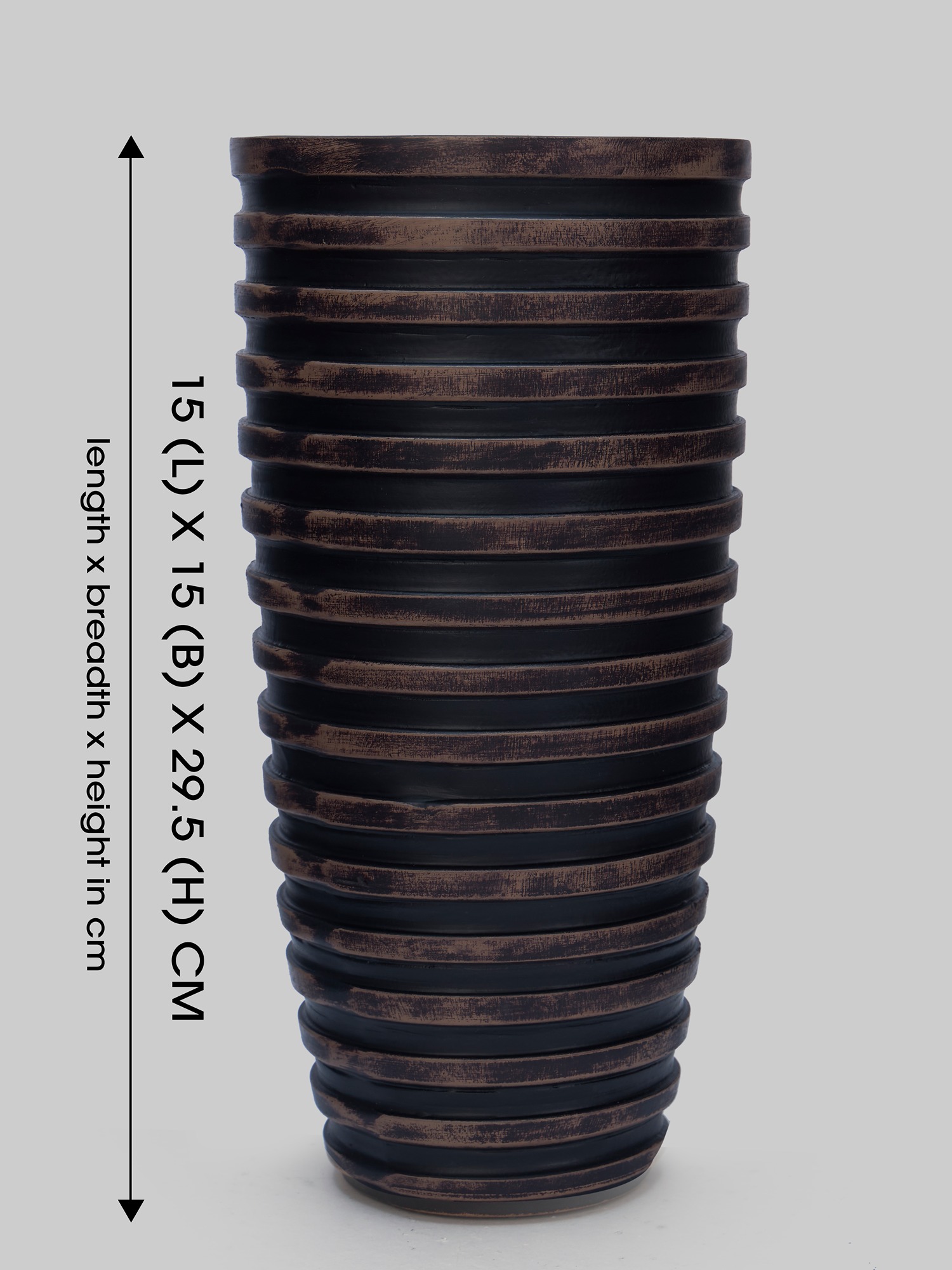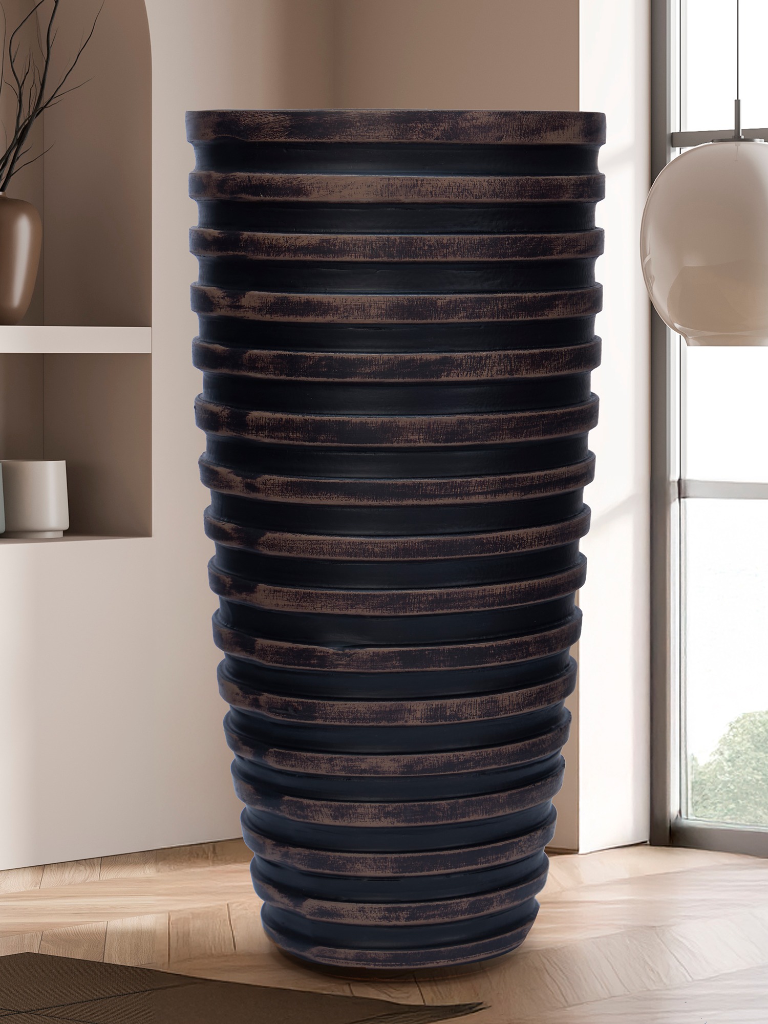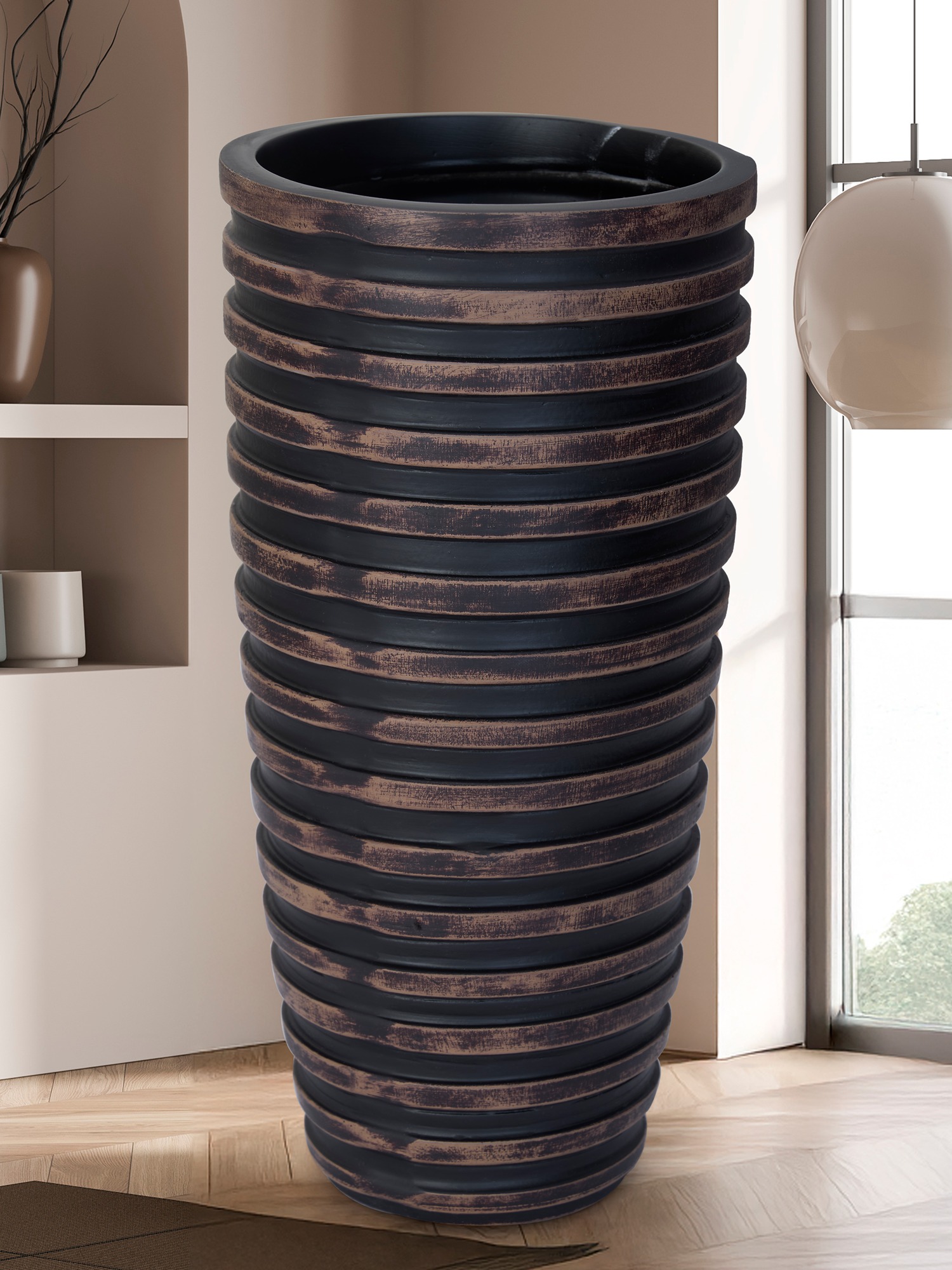 Transform your space with the MODECOR Striped Black Cylindrical Vase (AGT-1062-Brown). Featuring bold horizontal ridges and earthy wooden tones, this vase blends contemporary aesthetics with rustic elegance. Its tall, sleek silhouette adds a touch of grandeur, making it an eye-catching centerpiece or a functional decor piece for flowers or branches. Whether placed in the living room, hallway, or office, this vase introduces warmth, texture, and sophistication, enhancing the ambiance of any modern or eclectic interior. Its versatile design ensures seamless integration with various décor styles, effortlessly elevating any space.