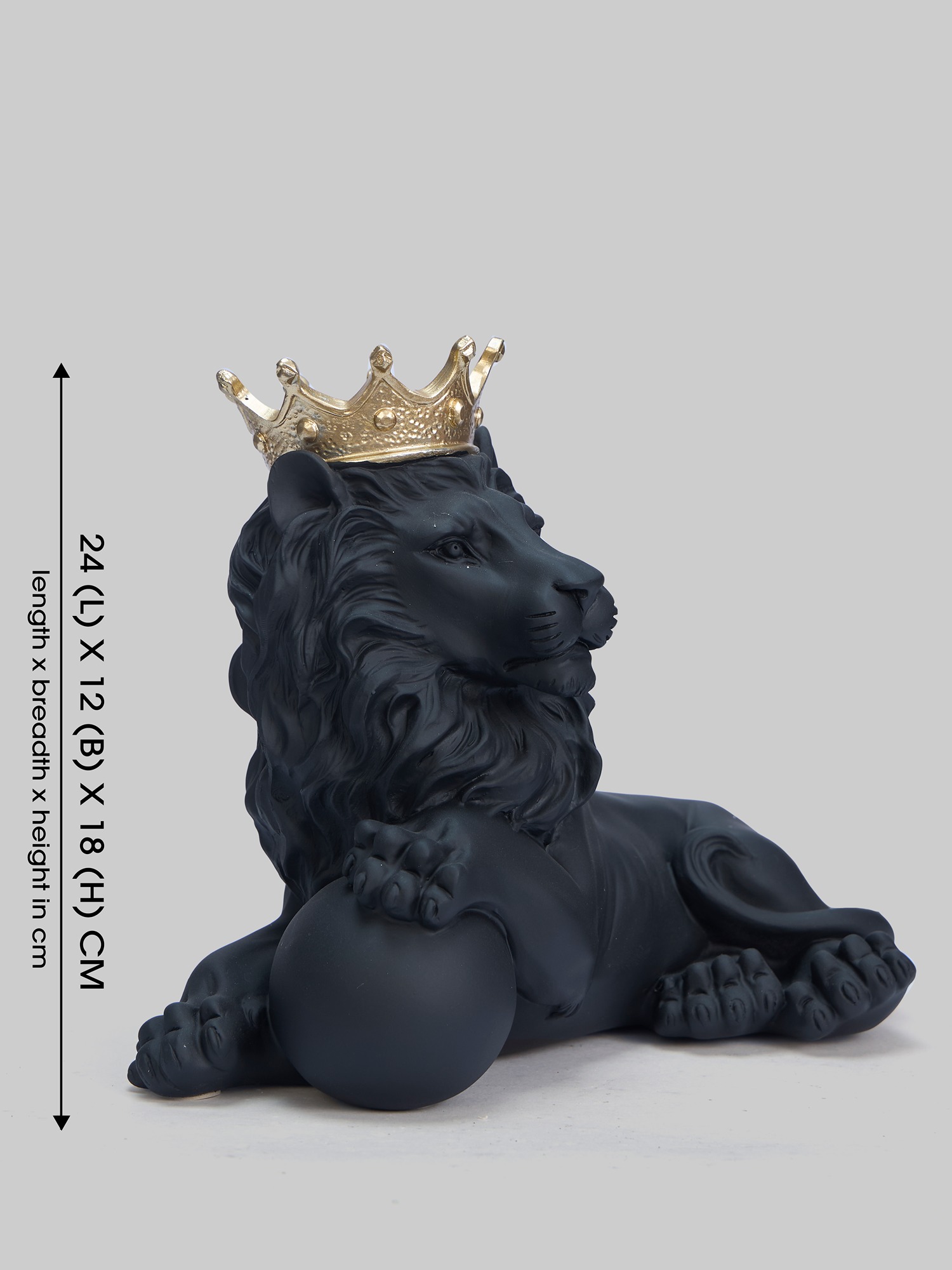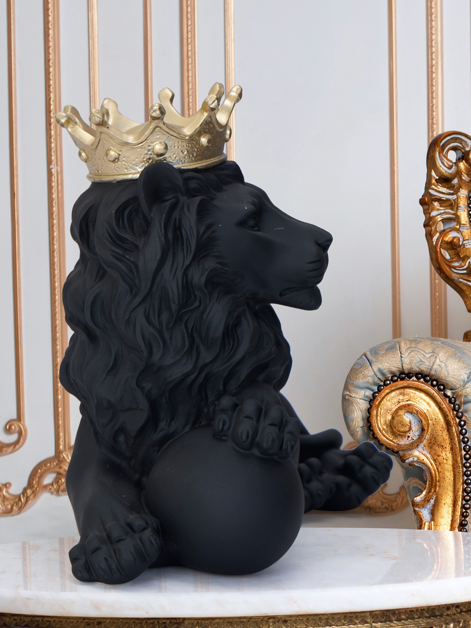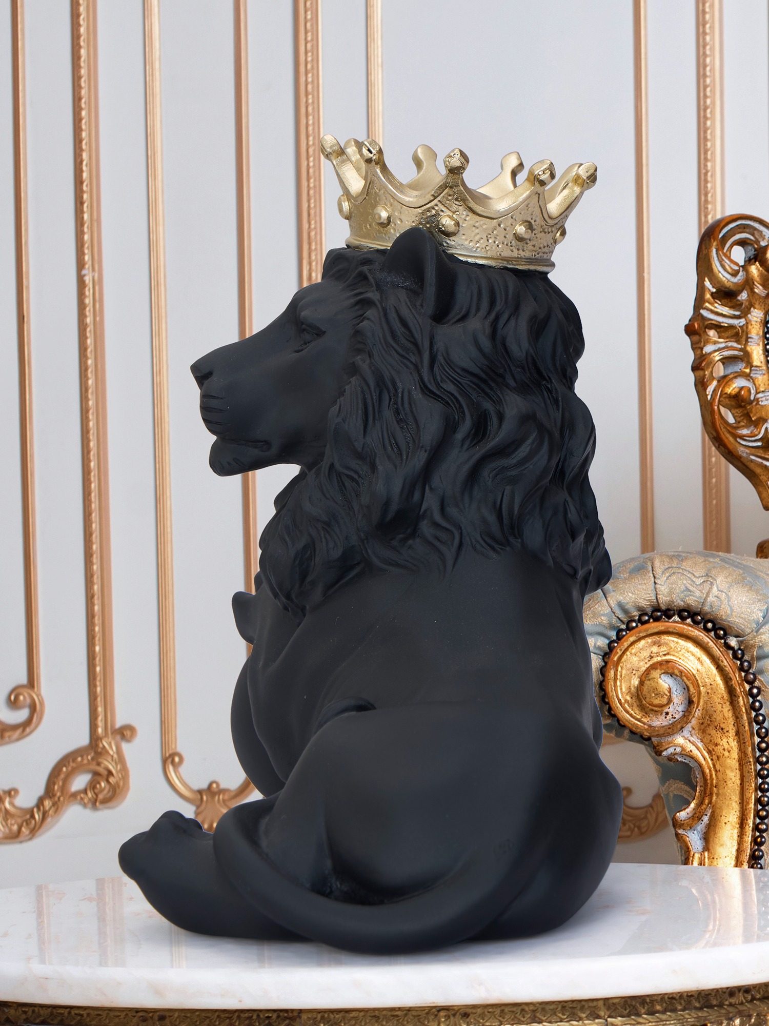 Transform your space with the MODECOR Majestic Crowned Lion Sculpture (AGT-1066-Black), a symbol of strength and elegance. This stunning piece features a regal lion in a matte black finish, beautifully adorned with a lustrous golden crown, exuding power and sophistication. Expertly crafted with intricate details, the lion rests gracefully on a polished base, adding a luxurious touch to any room. Perfect for display on a console table, mantel, or desk, this sculpture effortlessly combines classical grandeur with modern design. Elevate the ambiance of your living room, office, or study with this captivating and timeless work of art.