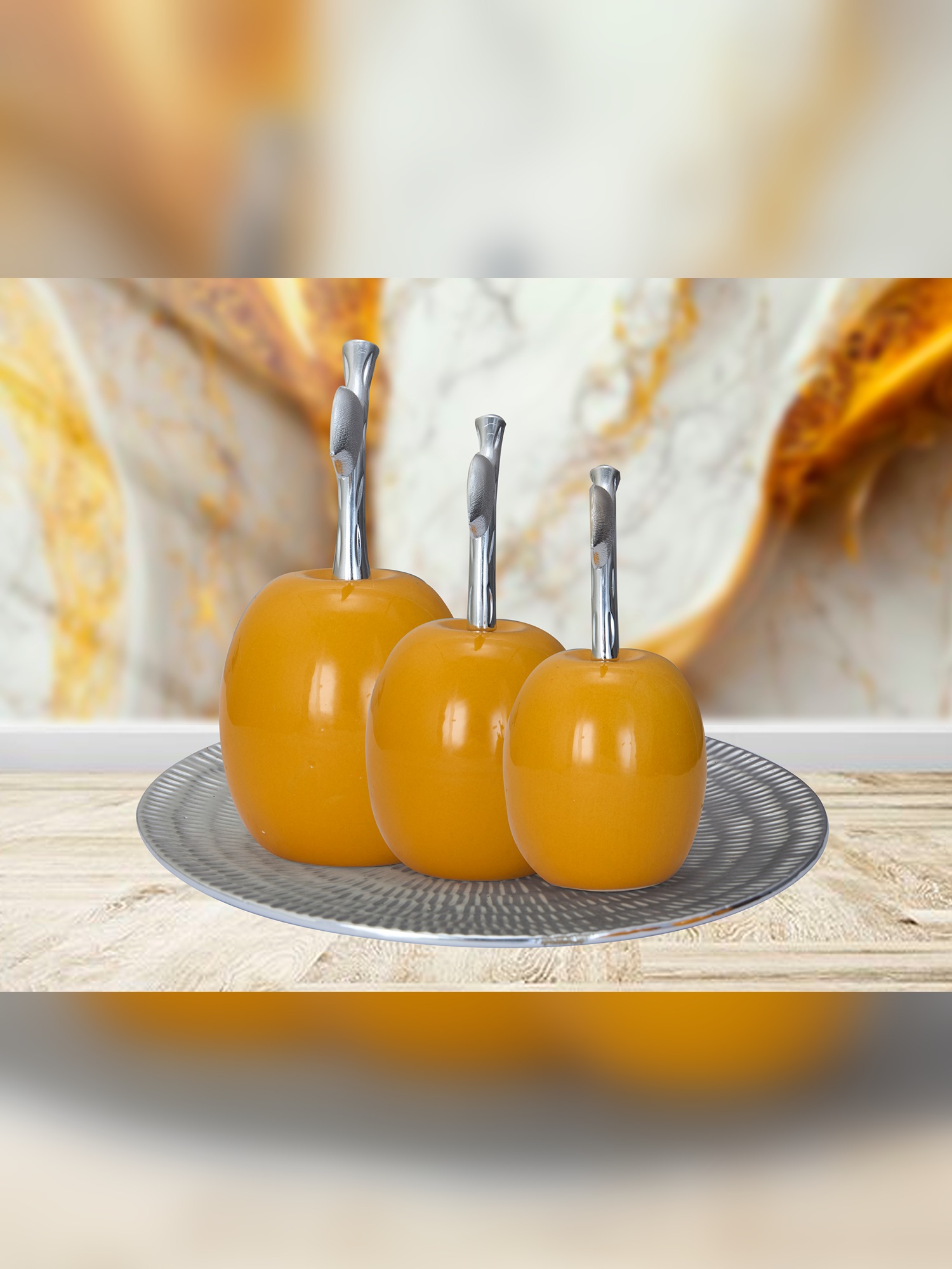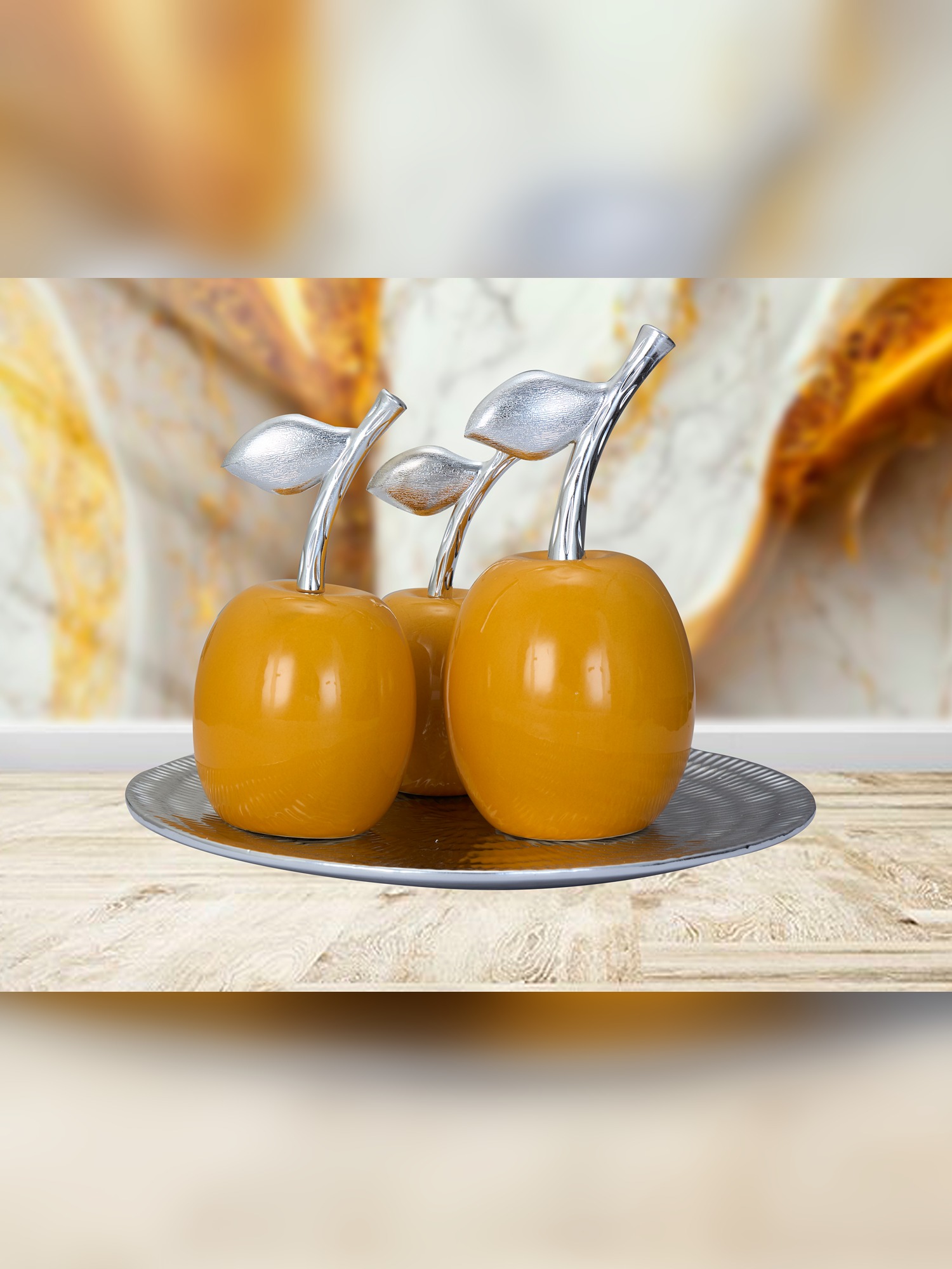 Transform your space with the MODECOR Decorative Apple Set of 3 (AGT-1068-Yellow), featuring a trio of glossy ceramic apples in a vibrant golden hue. Each apple is elegantly adorned with a silver stem and leaf, adding sophistication and charm to the design. Presented on a sleek metallic plate, this set makes for an eye-catching centerpiece on dining tables, sideboards, or coffee tables. The striking combination of bold color and reflective silver accents creates a stunning visual impact, making it the perfect addition to modern, eclectic, or contemporary interiors. Infuse your decor with a splash of warmth and elegance with this stylish set.