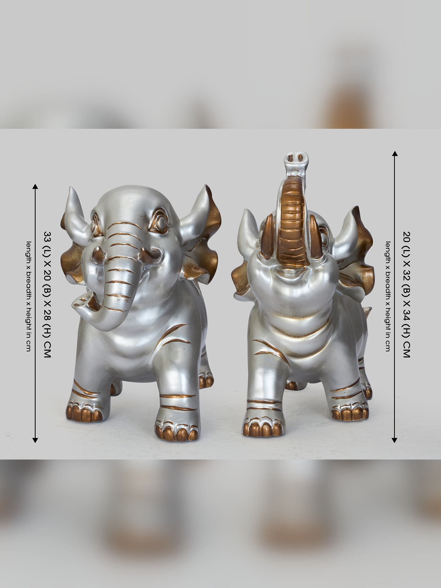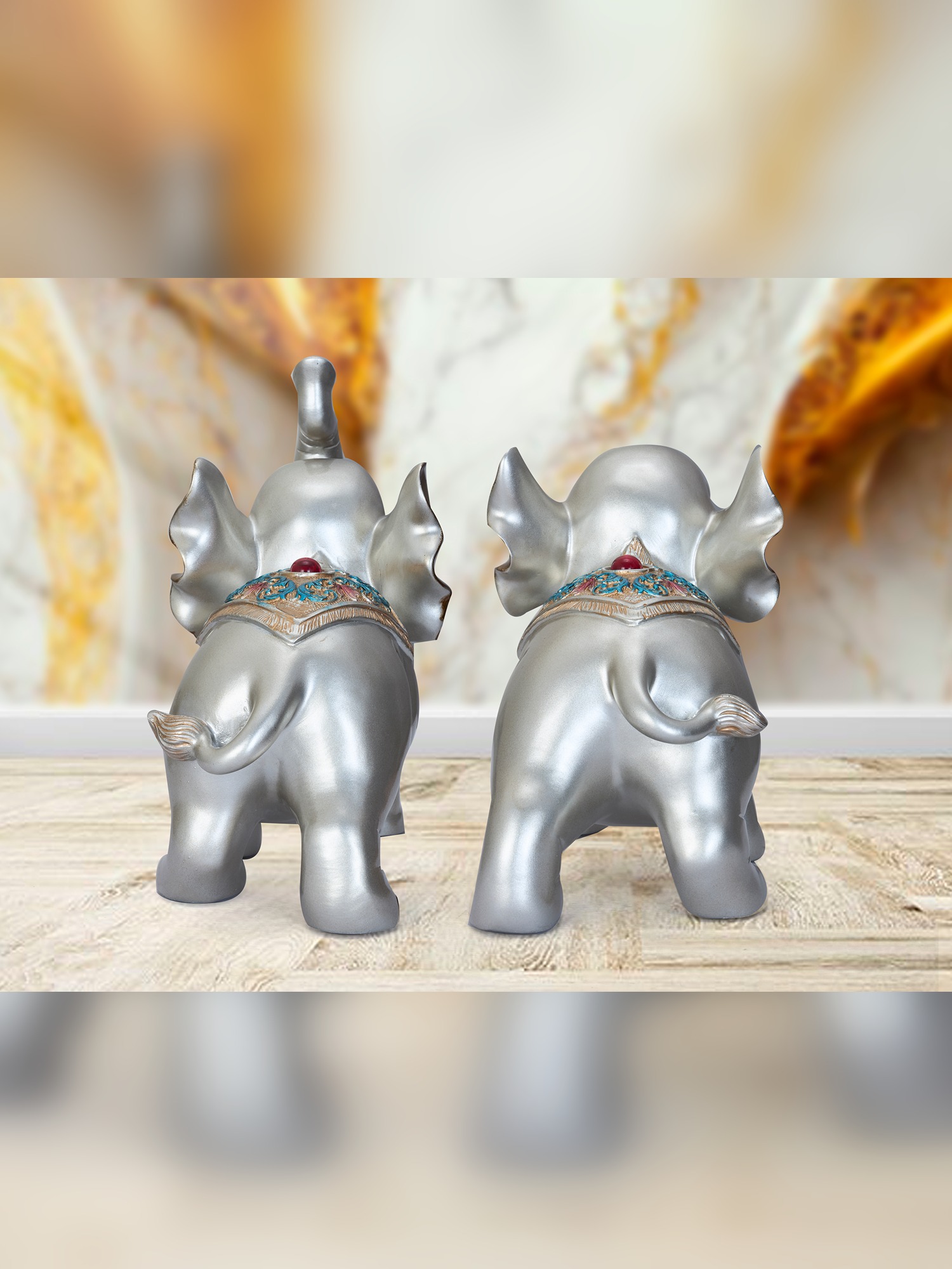 Transform your space with the MODECOR Decorative Elephant Pair (AGT-1071-SILVER), featuring two intricately designed elephants in a luxurious silver finish with golden accents. These charming figurines showcase exquisite craftsmanship, with their raised trunks symbolizing good luck and positivity. Perfect for display on a mantel, shelf, or side table, this set adds a touch of elegance and cultural significance to any decor. The harmonious blend of silver and gold tones creates a sophisticated and eye-catching look, making these elephants a standout addition to modern, eclectic, or traditional interiors. Bring grace, prosperity, and timeless charm to your home with this elegant duo.