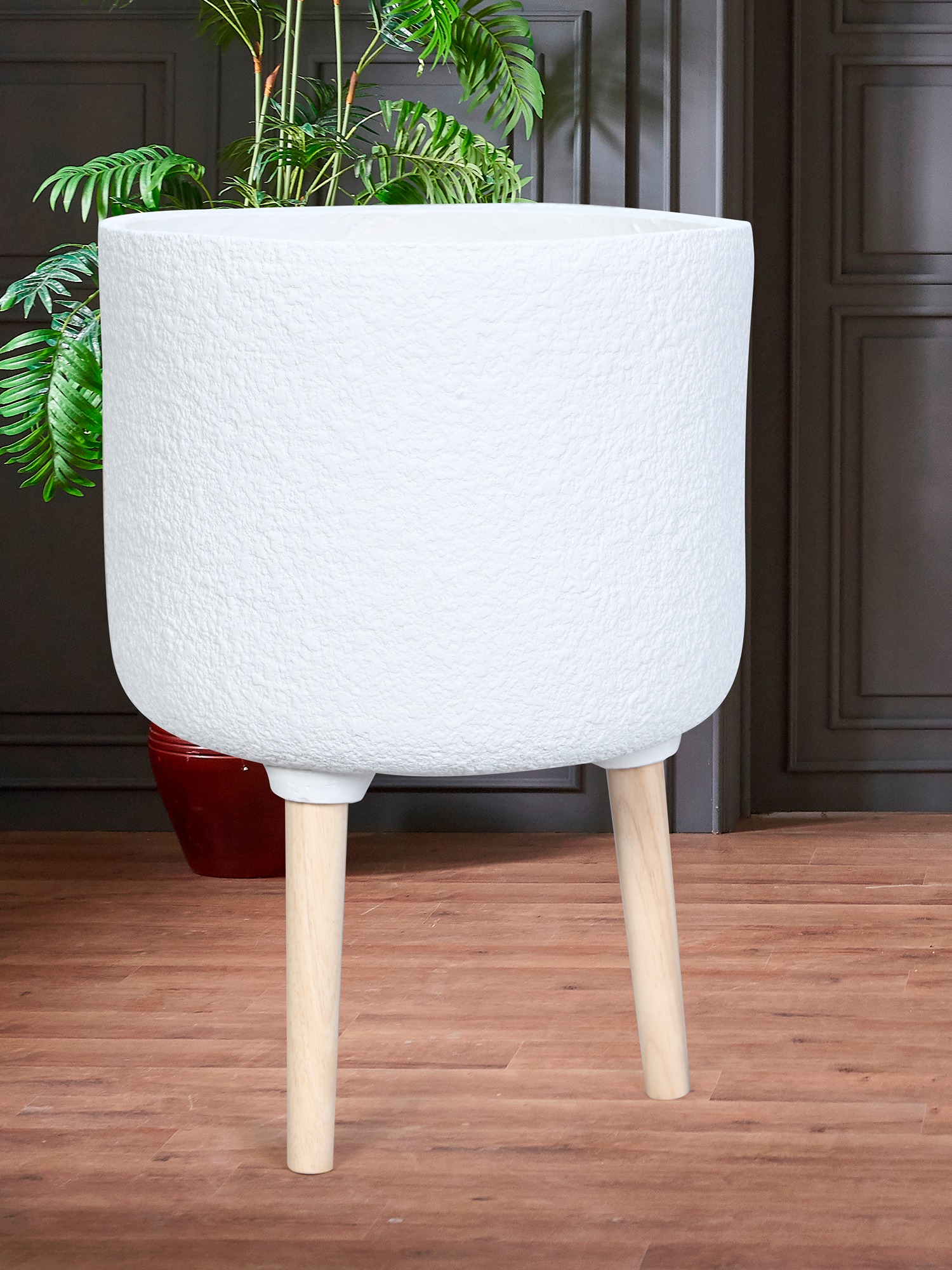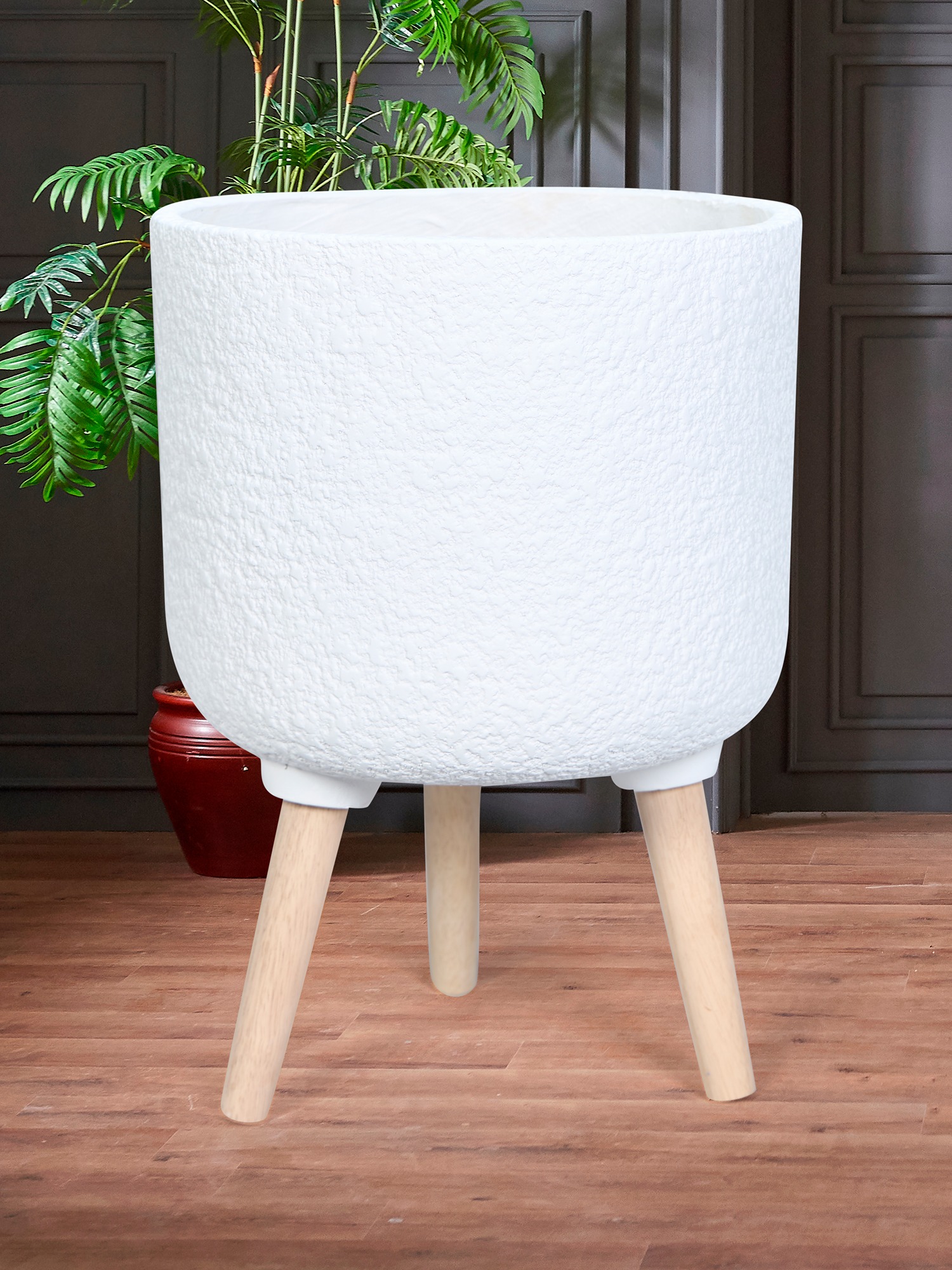 Elevate your décor with the MODECOR Modern White Planter Set of 3 with Wooden Legs-a seamless fusion of minimalism and functionality. This set features three planters with a sleek white textured finish, exuding elegance, and sturdy natural wooden legs inspired by Scandinavian design.Crafted from durable fiber-reinforced polymer (FRP), these planters outperform traditional plastic alternatives by withstanding harsh weather conditions, including UV radiation, temperature fluctuations, and salt air. Resistant to chipping, cracking, and color fading, they are designed to last for years, offering an eco-friendly and cost-effective solution for your greenery needs. Perfectly blending rustic charm with contemporary style, these planters are versatile enough to enhance any space-be it your home, office, balcony, or garden. Whether used indoors or outdoors, the MODECOR Modern White Planter Set adds sophistication and charm to your surroundings while beautifully showcasing your plants.