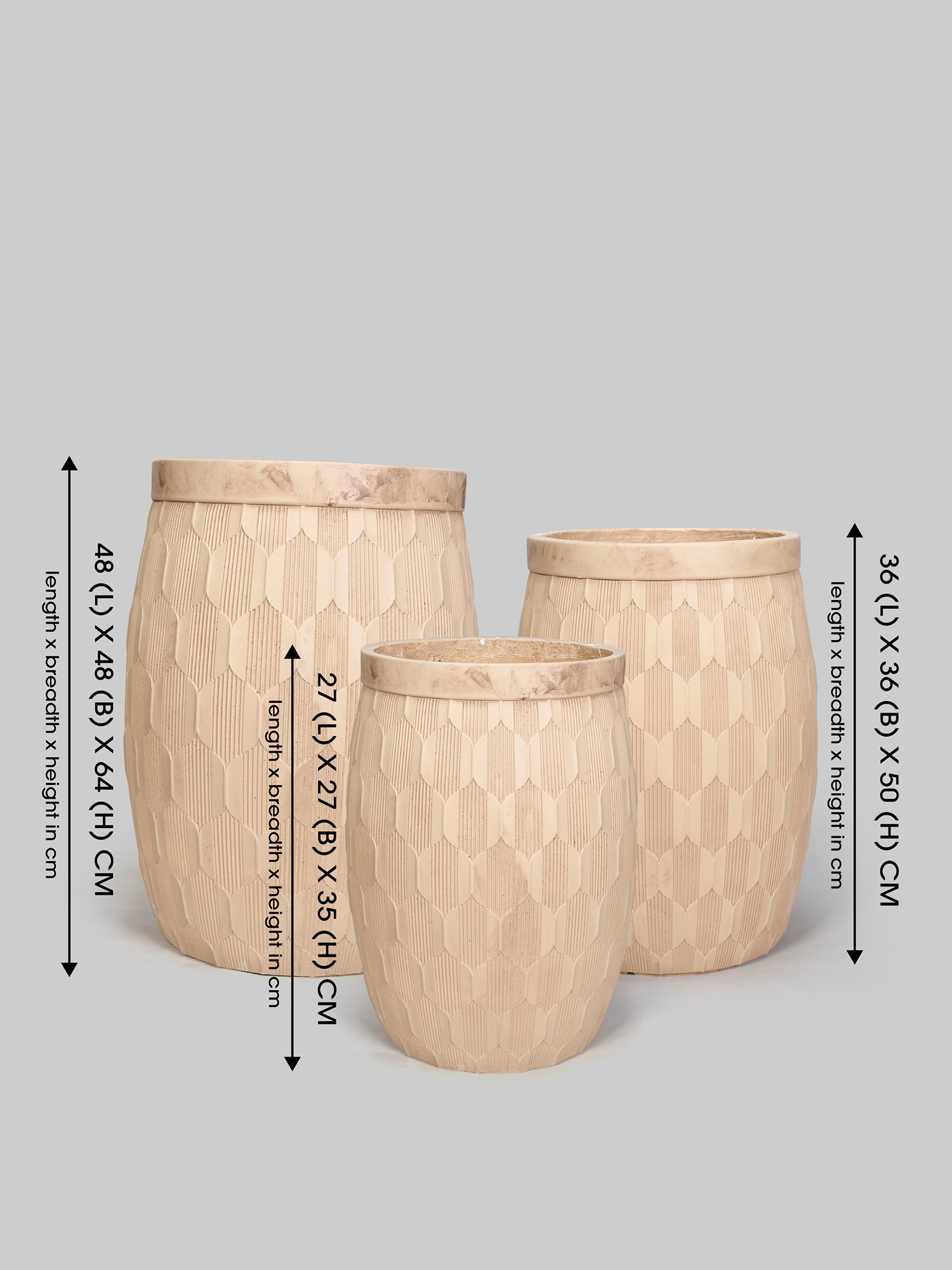 Size: | Big: 48(L) X 48(B) X 64(H) cms. Medium: 36(L) X 36(B) X 50(H) cms. Small: 27(L) X 27(B) X 35(H) cms |