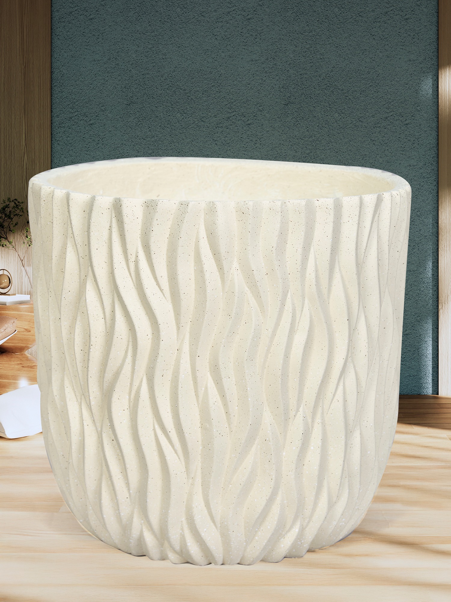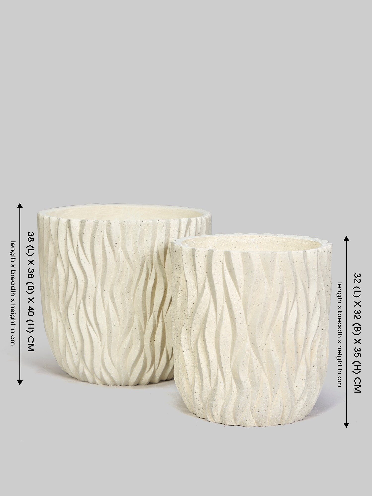 Add a touch of elegance and sophistication to your decor with the MODECOR Flow-Textured Beige Planter Set of 2. Featuring a dynamic flow-inspired texture in a soft beige tone, these planters create a sense of movement and artistry that complements any space. Their versatile design is ideal for modern, bohemian, or minimalist interiors and gardens.Elevate your home or garden decor with the MODECOR Flow-Textured Beige Planter Set, a stylish and functional way to highlight your greenery while adding timeless charm to your space.Crafted from high-quality fiber-reinforced polymer (FRP), these lightweight yet durable planters are perfect for both indoor and outdoor use and can be expensive upfront but are often cheaper in the long run.FRP planters are made of a composite material that can withstand various weather conditions, including UV radiation, temperature variations, and salt air. They are also resistant to chipping, cracking, and color fading- last for years And are an eco-friendly, unlike plastic planters which may crack, break, or fade after one season. Featuring a sophisticated matte grey finish, this set seamlessly complements any décor style, from contemporary to classic. Each pot in the set is carefully sized to accommodate plants of various sizes, making it ideal for your home, office, living room, balcony, or garden.