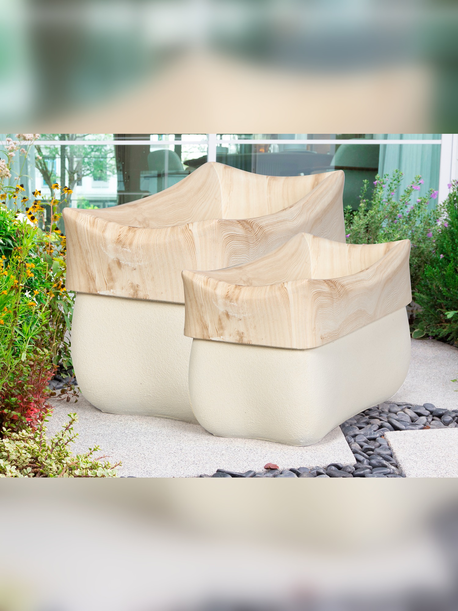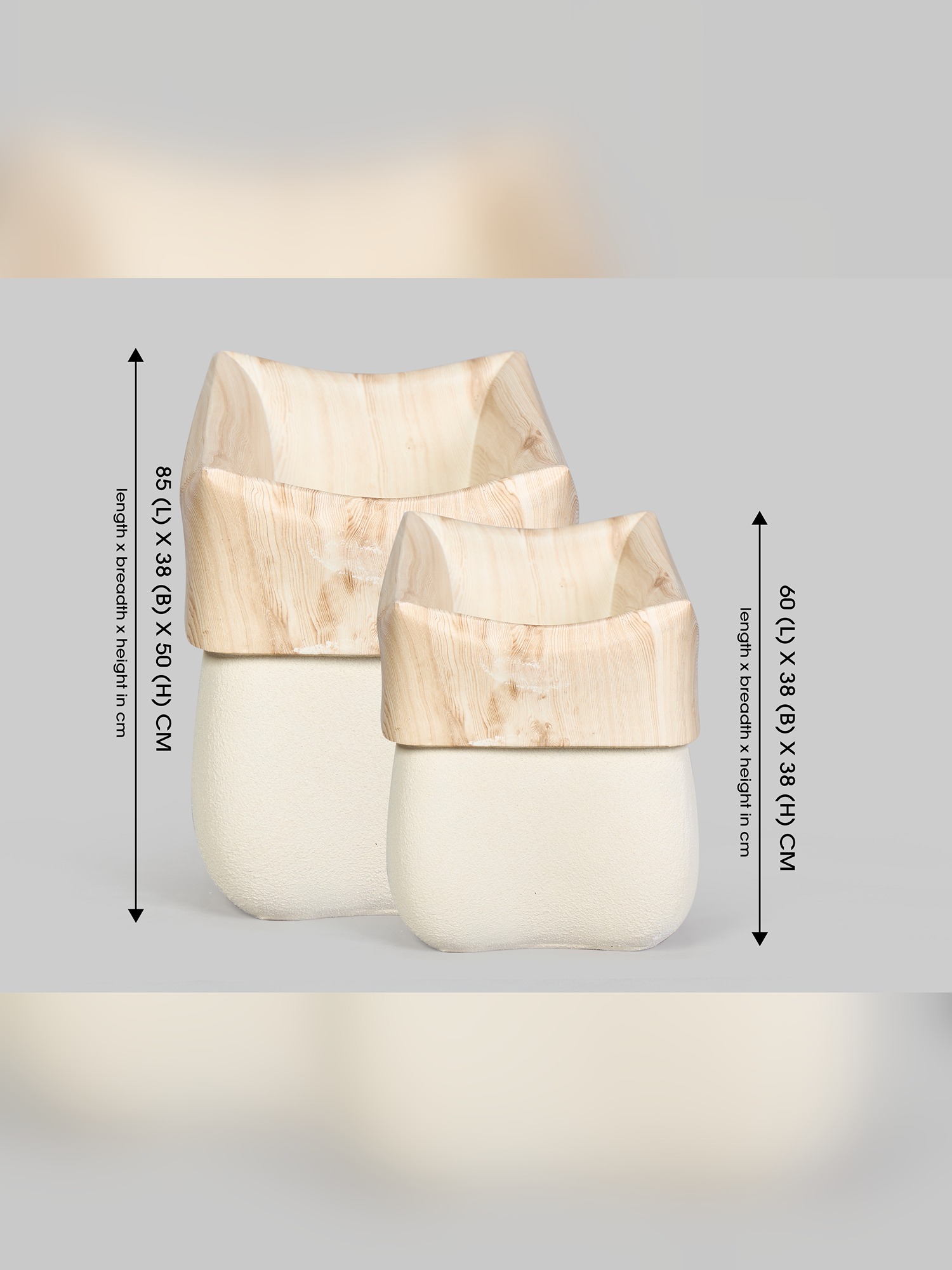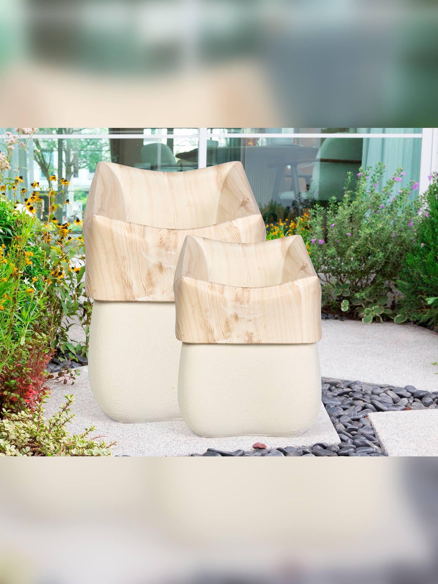 Elevate your garden or living space with the MODECOR Sculpted Wood and Cream Planter Set of 2, a perfect fusion of natural aesthetics and modern design. These planters feature a beautifully sculpted wooden top paired with a cream-toned textured base, creating a harmonious blend of organic warmth and contemporary style. Their unique form adds a sophisticated touch to any setting, indoors or outdoors.Transform your home or garden with the MODECOR Sculpted Wood and Cream Planter Set, a timeless and elegant choice for plant lovers who value design and functionality.Crafted from high-quality fiber-reinforced polymer (FRP), these lightweight yet durable planters are perfect for both indoor and outdoor use and can be expensive upfront but are often cheaper in the long run.FRP planters are made of a composite material that can withstand various weather conditions, including UV radiation, temperature variations, and salt air. They are also resistant to chipping, cracking, and color fading- last for years And are an eco-friendly, unlike plastic planters which may crack, break, or fade after one season. Featuring a sophisticated matte grey finish, this set seamlessly complements any décor style, from contemporary to classic. Each pot in the set is carefully sized to accommodate plants of various sizes, making it ideal for your home, office, living room, balcony, or garden.