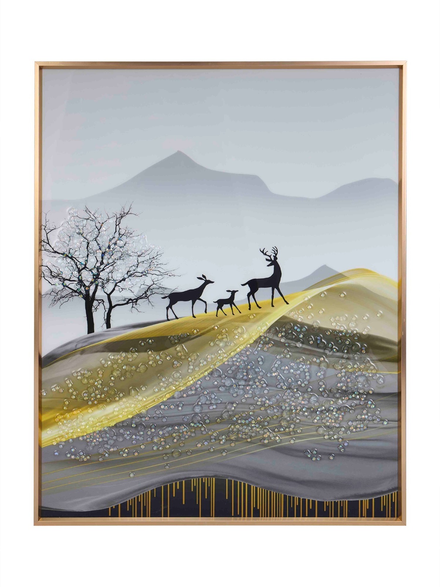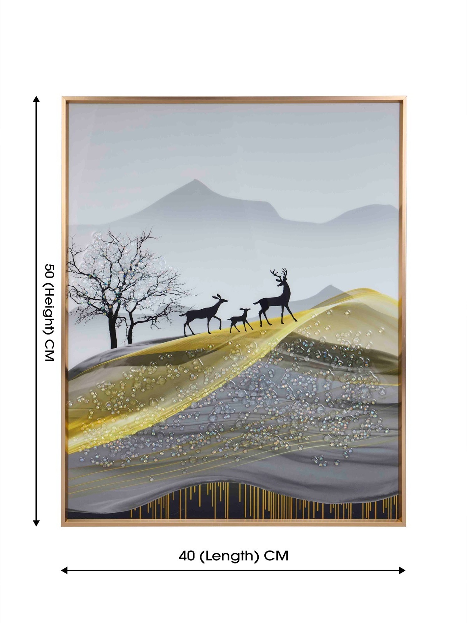 Transform your living spaces with the serene elegance of the MODECOR Wall Photo Frame Painting (FGT-2014). Measuring 40x50 cm, this breathtaking artwork features a tranquil landscape of rolling golden and gray hills, adorned with shimmering details and a silhouette of a family of deer set against a soft, misty mountain backdrop. A solitary tree adds to the peaceful ambiance of the scene.Anodized Aluminum Frames are more expensive than basic frames due to the specialized anodizing process, which involves high setup costs and the use of specialized equipment. This process not only adds to the cost but also enhances the durability of the frames, ensuring they last for a minimum of 10–20 years.Encased in a luxurious gold frame, this painting is perfect for modern or minimalist interiors, creating a calming and sophisticated focal point.