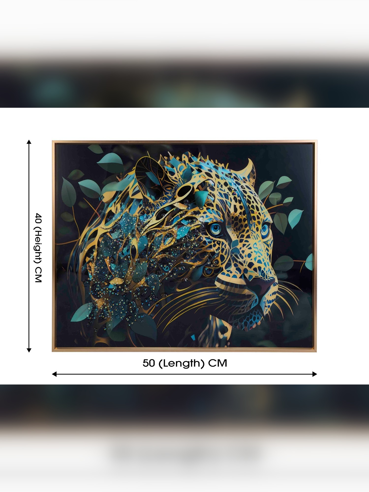 This stunning 40x50 cm (16x20) inches framed artwork features a mesmerizing depiction of a leopard intricately blended with vibrant leaves and floral patterns, creating a fusion of nature and abstract design. The artwork is rich in shades of deep teal, gold, and black, with piercing blue eyes that draw the viewer in. Anodized Aluminum Frames are more expensive than basic frames due to the specialized anodizing process, which involves high setup costs and the use of specialized equipment. This process not only adds to the cost but also enhances the durability of the frames, ensuring they last for a minimum of 10–20 years.Encased in an elegant gold frame, the piece adds a touch of sophistication and drama to any space. Perfectly suited for modern, eclectic, or luxurious interiors, it serves as a captivating centerpiece for walls in living rooms, lounges, or art galleries.