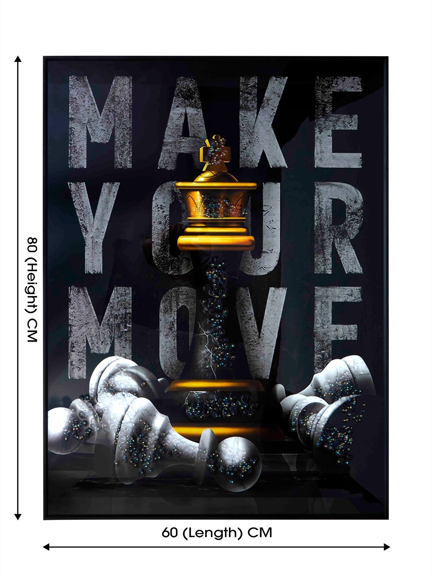 Make an impactful statement with the MODECOR Wall Photo Frame Painting (FGT-2048). Measuring 60x80 cm, this larger piece showcases the victorious golden chess king with the powerful phrase "MAKE YOUR MOVE," set against a dramatic background. Anodized Aluminum Frames are more expensive than basic frames due to the specialized anodizing process, which involves high setup costs and the use of specialized equipment. This process not only adds to the cost but also enhances the durability of the frames, ensuring they last for a minimum of 10-20 years.The intricate details and bold tones make it a centerpiece that commands attention.Encased in a sleek frame, this artwork is perfect for expansive spaces like executive offices or grand living areas, adding depth, inspiration, and elegance to your décor.