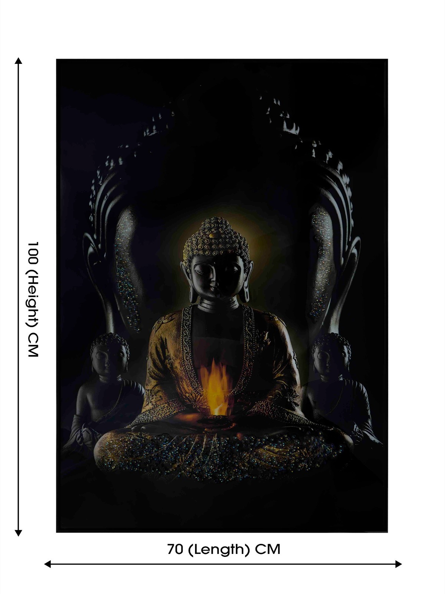"Bring peace and elegance to your interiors with the MODECOR Wall Photo Frame Painting (FGT-2053). Measuring 70x100 cm, this artwork features a serene depiction of Buddha, surrounded by a calming aura and golden accents. The central flame symbolizes enlightenment and tranquility, making it a perfect choice for creating a serene atmosphere in your home.Aluminum Frames are more expensive than basic frames due to the specialized anodizing process, which involves high setup costs and the use of specialized equipment. This process not only adds to the cost but also enhances the durability of the frames, ensuring they last for a minimum of 10-20 years.Framed in a sleek design, this piece fits beautifully in meditation corners, living rooms, or study areas, adding a touch of spirituality and sophistication to your d�cor. "