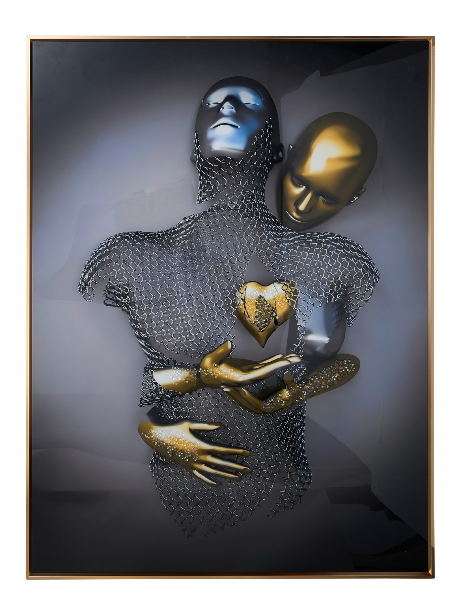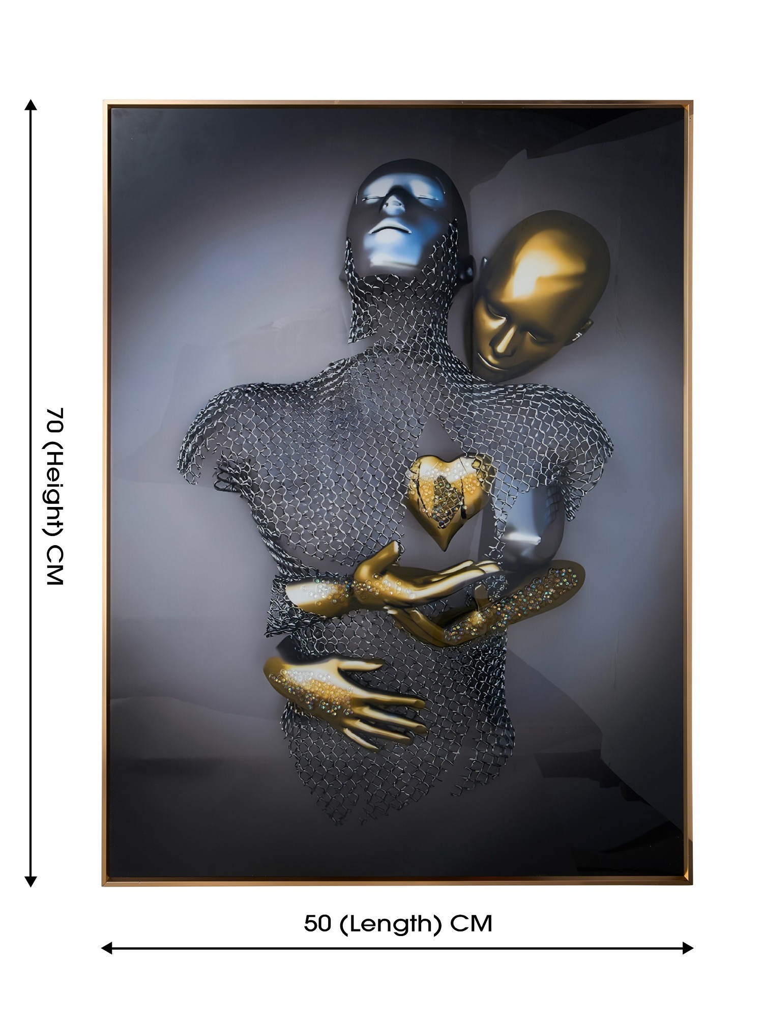 MODECOR's 50x70 cm (20x28) inches framed artwork is a mesmerizing representation of connection and emotion.Anodized Aluminum Frames are more expensive than basic frames due to the specialized anodizing process, which involves high setup costs and the use of specialized equipment. This process not only adds to the cost but also enhances the durability of the frames, ensuring they last for a minimum of 10–20 years. The piece showcases two abstract figures, one in radiant metallic gold and the other in a textured silver mesh, cradling a golden heart that symbolizes love and unity. The subtle interplay of light and shadow adds depth and intrigue, while the composition radiates a sense of compassion and togetherness. Encased in a sleek frame, this artwork is ideal for contemporary interiors, adding a modern yet heartfelt touch to living rooms, bedrooms, or office spaces. Its unique design and powerful symbolism make it a standout piece that sparks meaningful conversations and elevates the ambiance of any room.