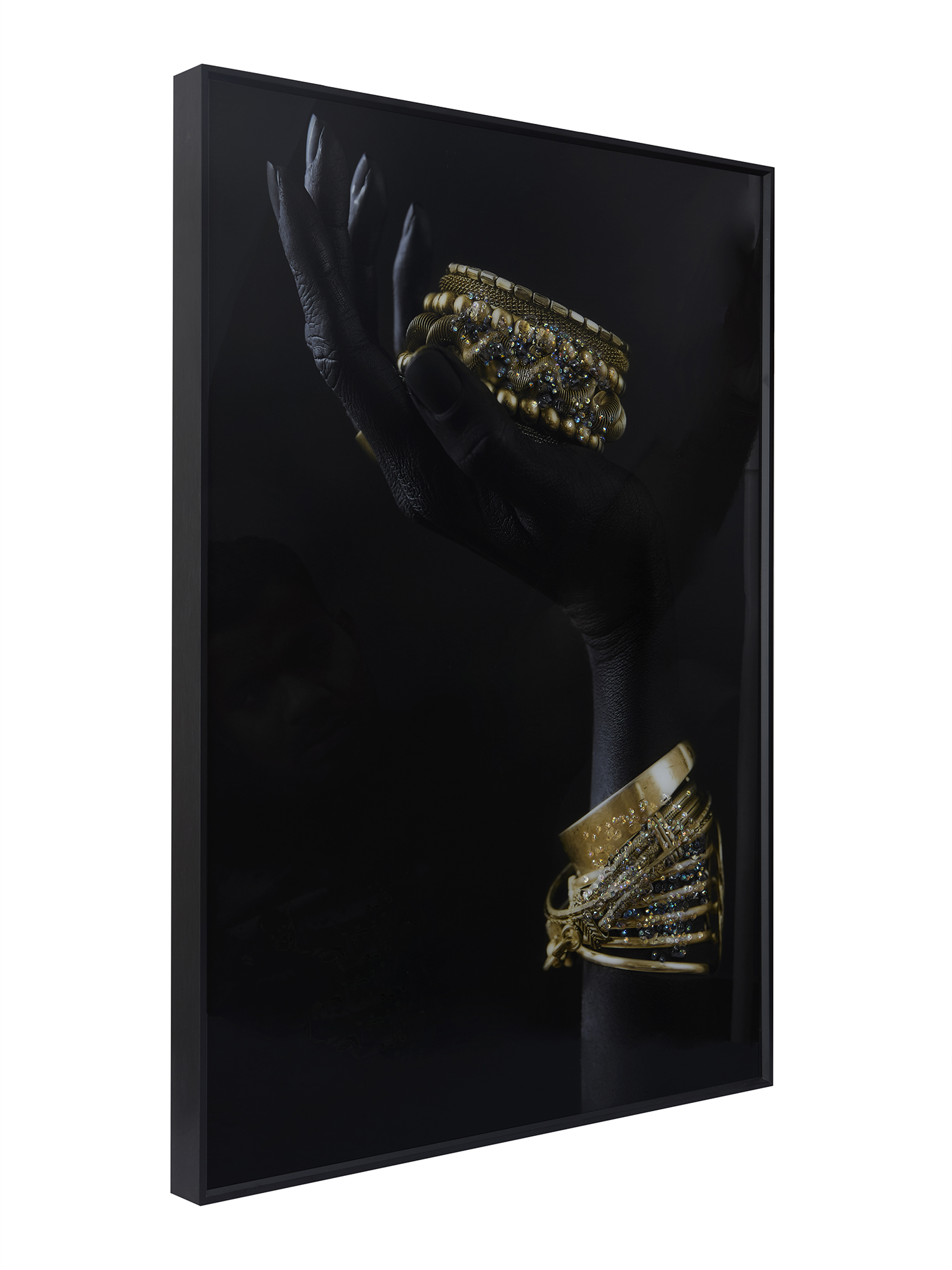 Add touch of sophistication and luxury to your space with this 50x70 cm (20x28) inches framed artwork. The composition features a gracefully posed hand, rendered in matte black, adorned with intricately designed golden bracelets and jewelry. Anodized Aluminum Frames are more expensive than basic frames due to the specialized anodizing process, which involves high setup costs and the use of specialized equipment. This process not only adds to the cost but also enhances the durability of the frames, ensuring they last for a minimum of 10–20 years.The rich textures and striking contrast between the dark background and the shimmering gold accents create a captivating visual effect.Perfect for contemporary or classic interiors, this piece exudes elegance and style, making it an ideal centerpiece for living rooms, bedrooms, or hallways. The clean frame enhances the artwork's allure, offering a refined statement piece that embodies timeless beauty and artistic finesse.