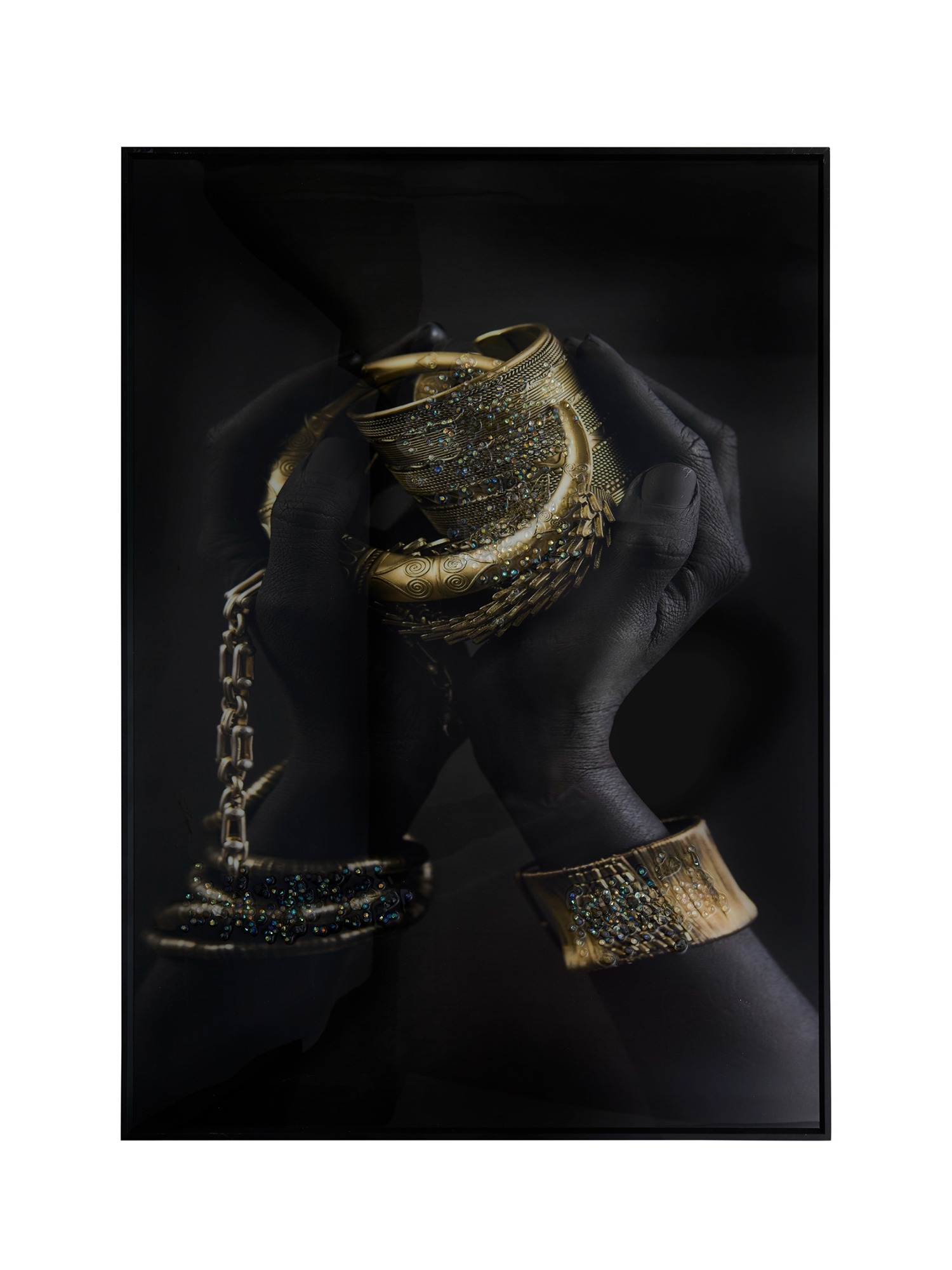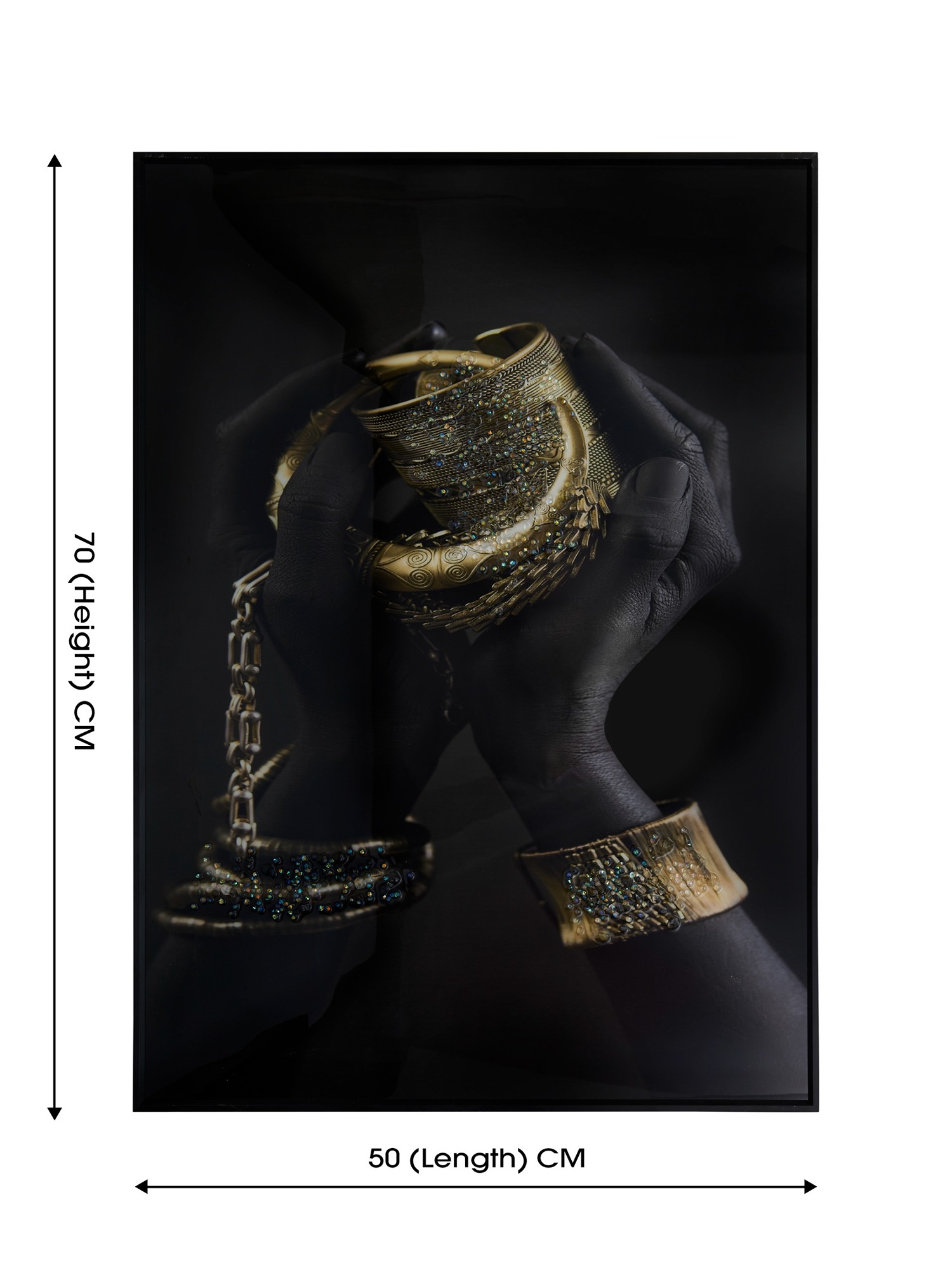 This exquisite 50x70 cm (20x28) inches framed artwork is a true celebration of elegance and opulence. Anodized Aluminum Frames are more expensive than basic frames due to the specialized anodizing process, which involves high setup costs and the use of specialized equipment. This process not only adds to the cost but also enhances the durability of the frames, ensuring they last for a minimum of 10–20 years. It features a beautifully posed black hand adorned with intricate golden bracelets and jewelry, reflected gracefully on a glossy surface. The interplay of light and shadow emphasizes the fine details, creating a captivating and luxurious aesthetic.This artwork is perfect for upscale interiors, adding a sophisticated and artistic touch to living rooms, bedrooms, or office spaces. The dark tones and gold accents create a striking contrast, making it an eye-catching centerpiece. A timeless piece that embodies refinement and artistic allure.